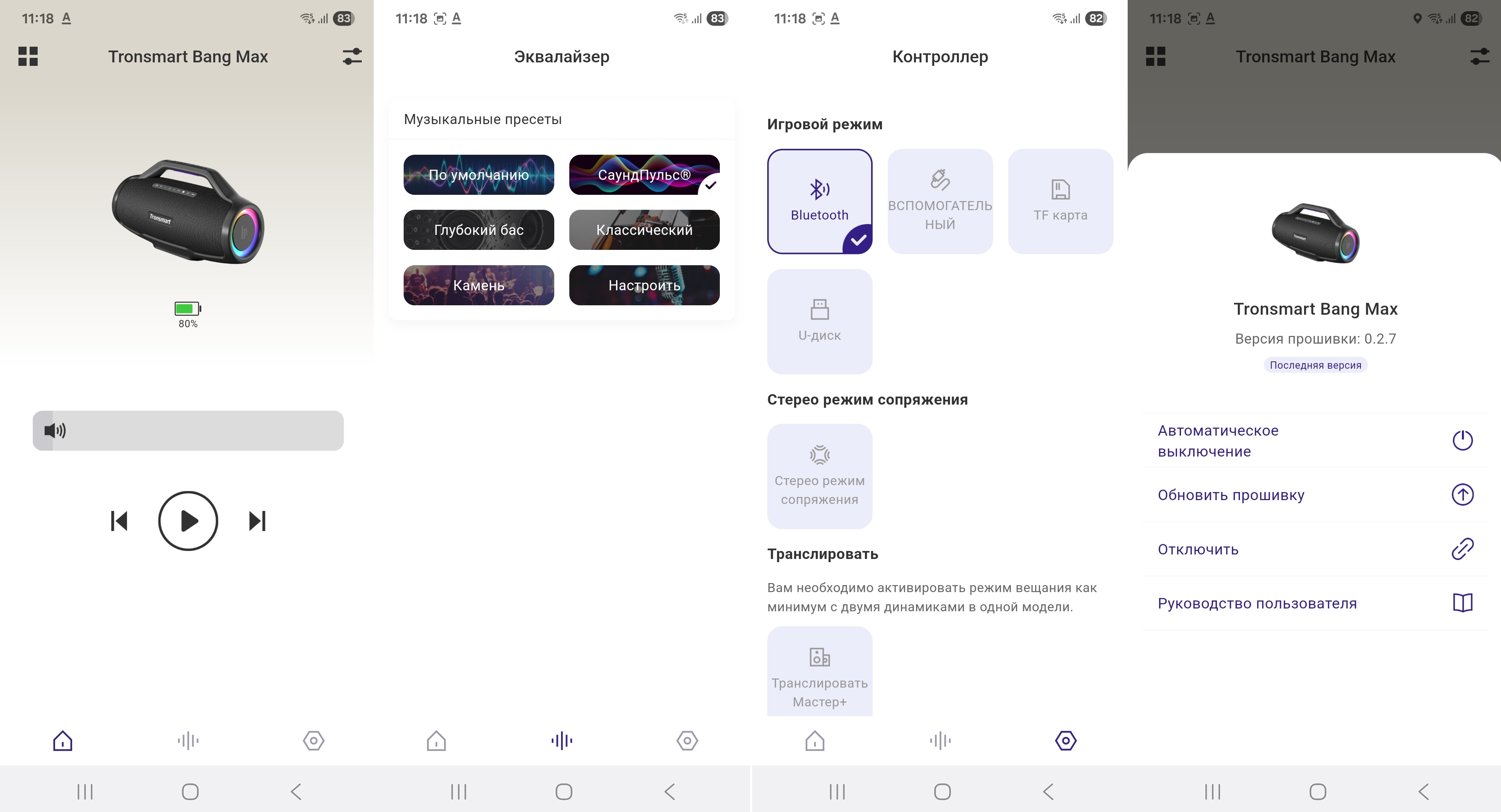 Особенно хорошо Tronsmart Bang Max проявила себя на улице — её мощности хватило, чтобы обеспечить отличный звук для большой компании, а динамичная RGB-подсветка создала нужную атмосферу с наступлением темноты. Управлять колонкой удобно через фирменное приложение, где можно настраивать эквалайзер, выбирать режимы работы и регулировать подсветку. Дополнительный плюс — возможность объединения двух таких колонок в стереосистему с помощью технологии TWS. Наличие влагозащиты позволяет не переживать из-за брызг или лёгкого дождя.