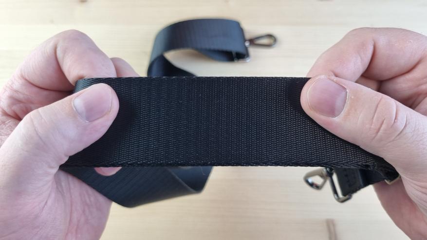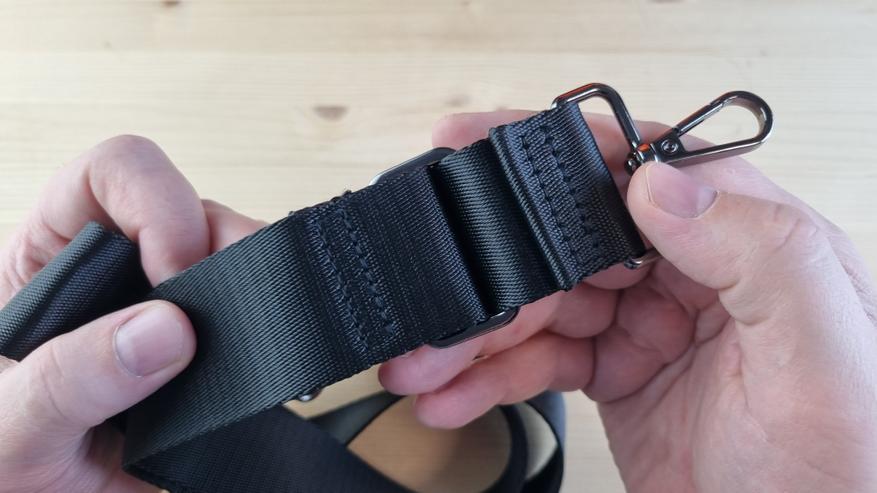 Внутри была документация, ремешок через плечо и средних размеров Type C кабель. Вроде как скромно, однако лично я вижу в этом гигантское достоинство — теперь не нужно брать с собой ни сетевой кабель, ни уж тем более, специальный зарядный блок — достаточно чего-то от телефона. Плюс ремешок на деле оказался удобным.