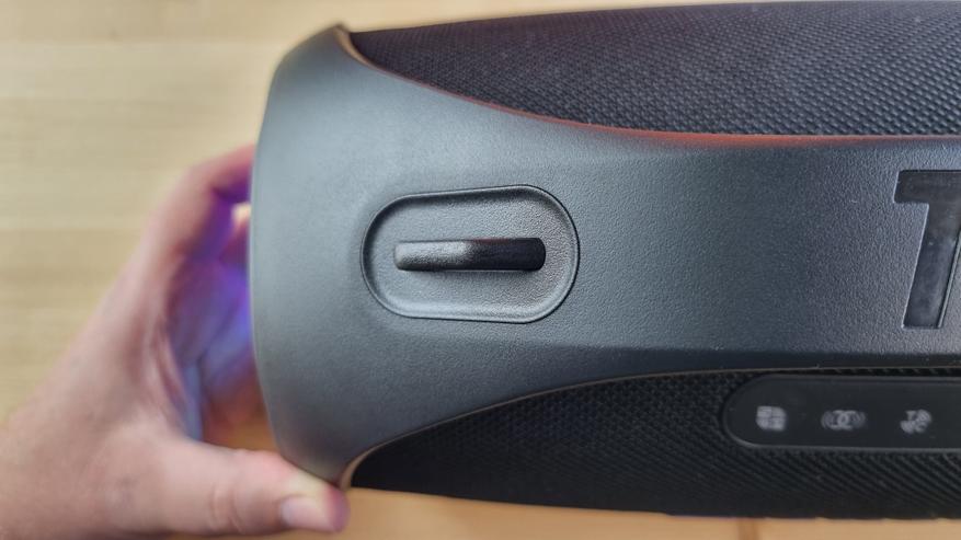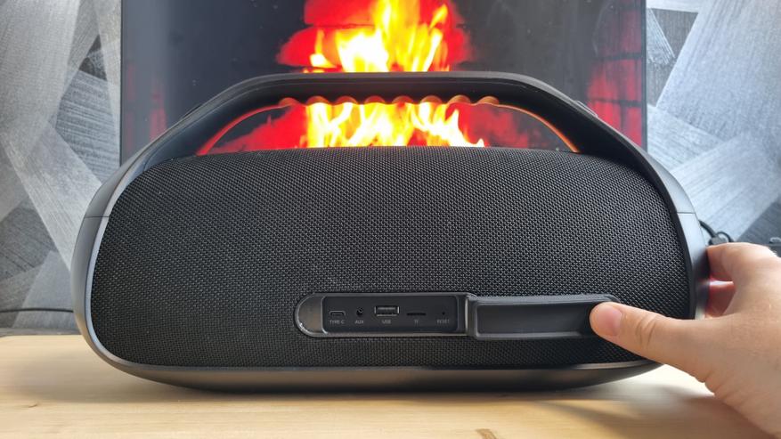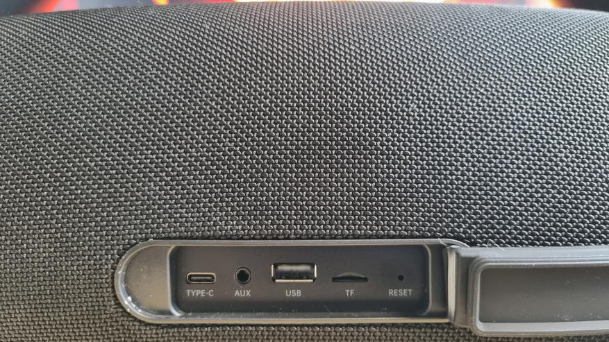 Вся остальная часть колонки обтянута водоотталкивающей тканью. Сзади, под резиновой заглушкой имеем зарядный Type C порт, кнопку сброса, AUX, слот для карт памяти и классический уже многофункциональный USB.