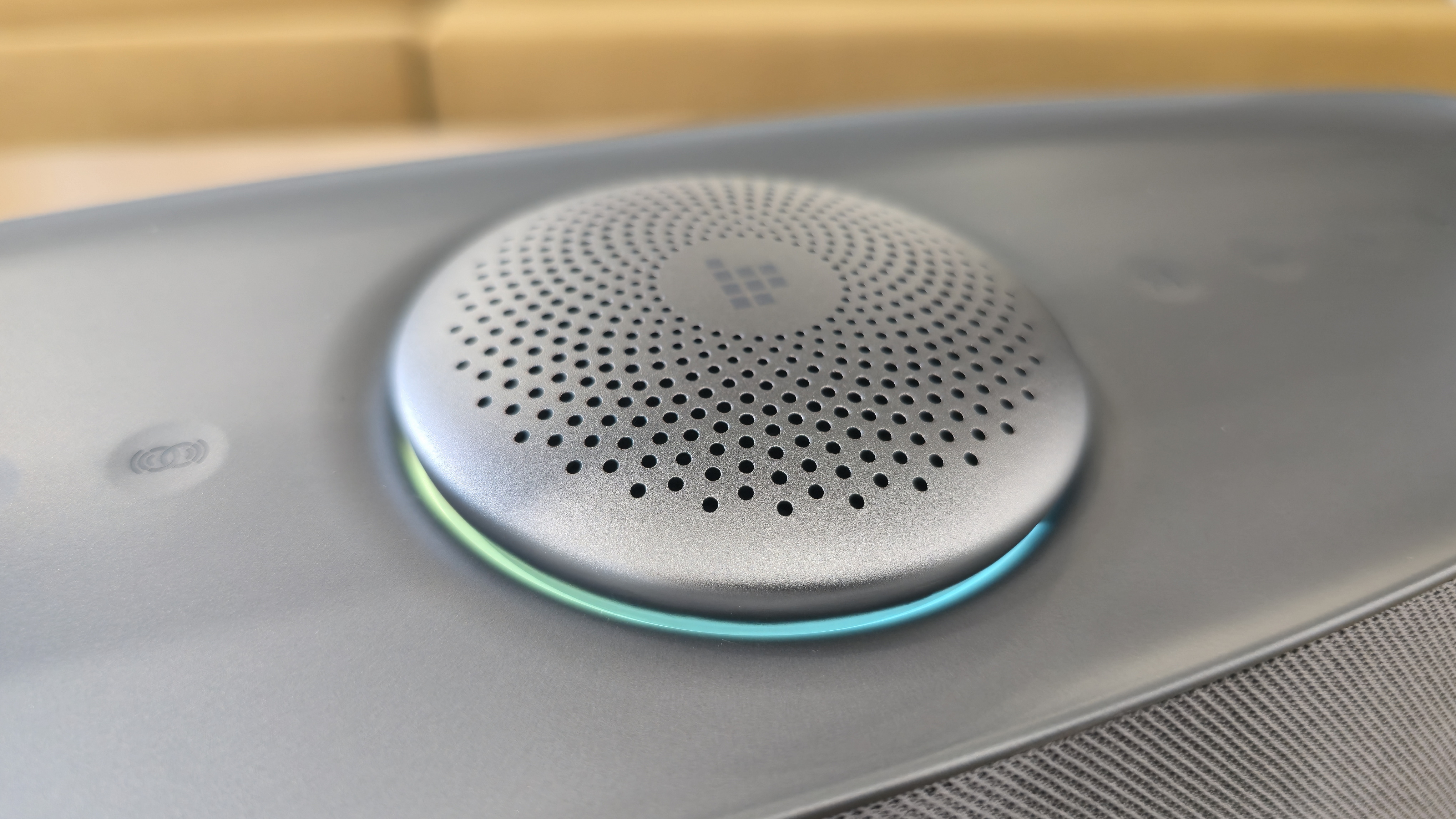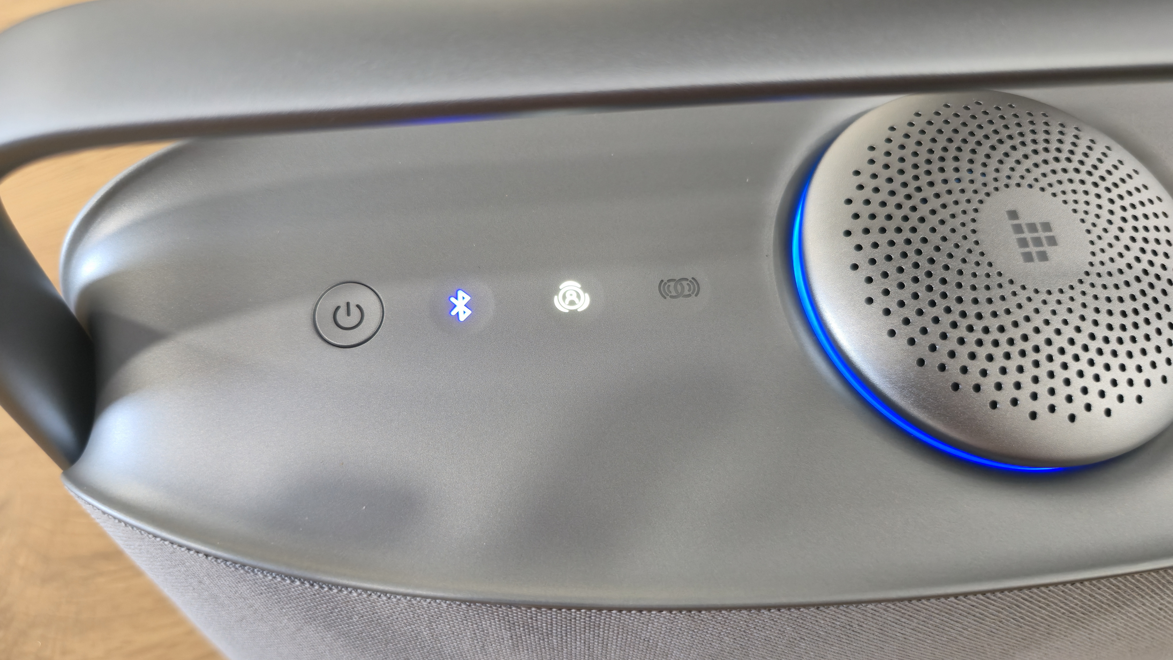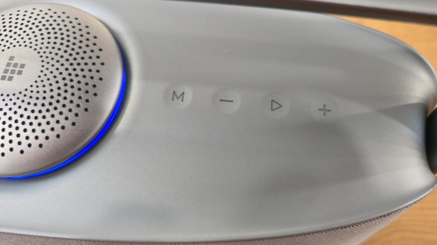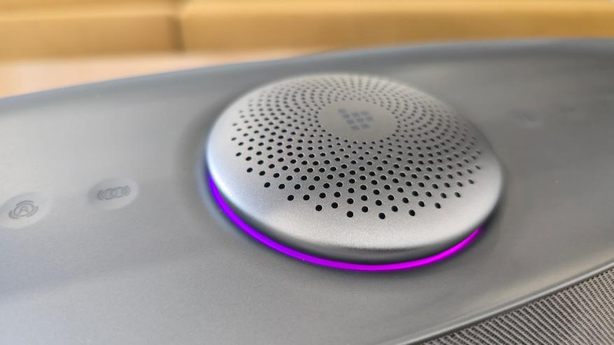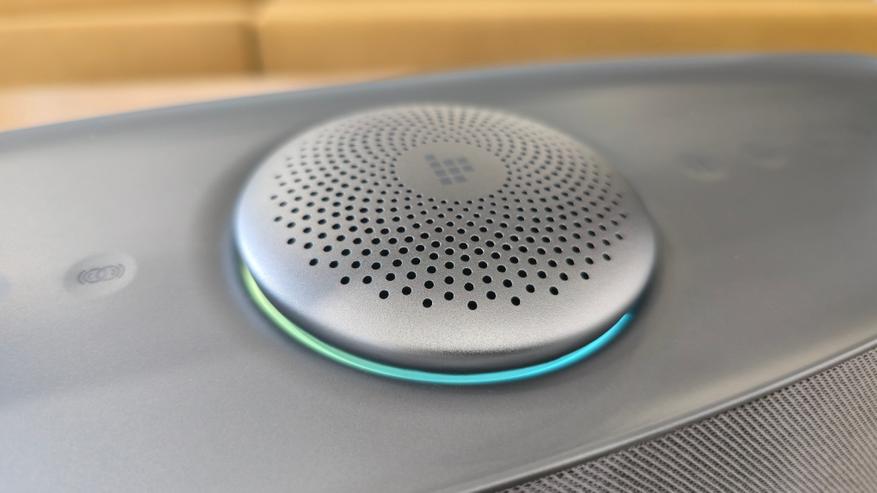 Верхняя панель сделана из пластика серого цвета и содержит все элементы управления. Слева находится кнопка включения с индикатором питания и зарядки, рядом расположена кнопка Bluetooth с пиктограммой и световой индикацией. Следом идет кнопка активации пространственного режима, а также клавиша для объединения двух колонок в стереопару, она же имеет индикатор сопряжения. Ближе к центру верхней панели установлен круглый излучатель, направленный вверх, вокруг которого расположена RGB-подсветка. Правее от него находится блок сенсорных кнопок: переключение режимов между Bluetooth и Aux, регулировка громкости с функцией перехода к следующему или предыдущему треку, а также клавиша воспроизведения и паузы.