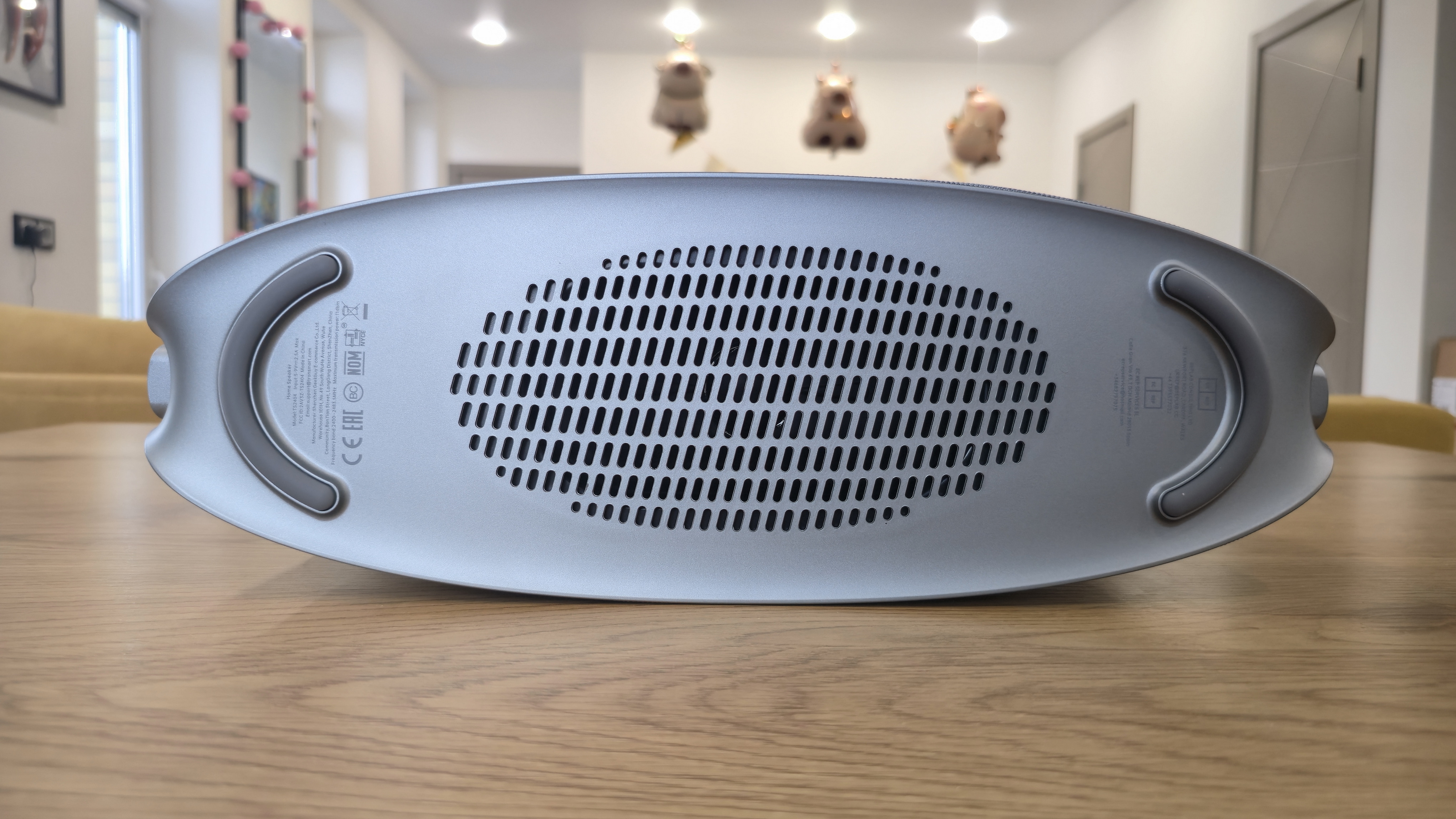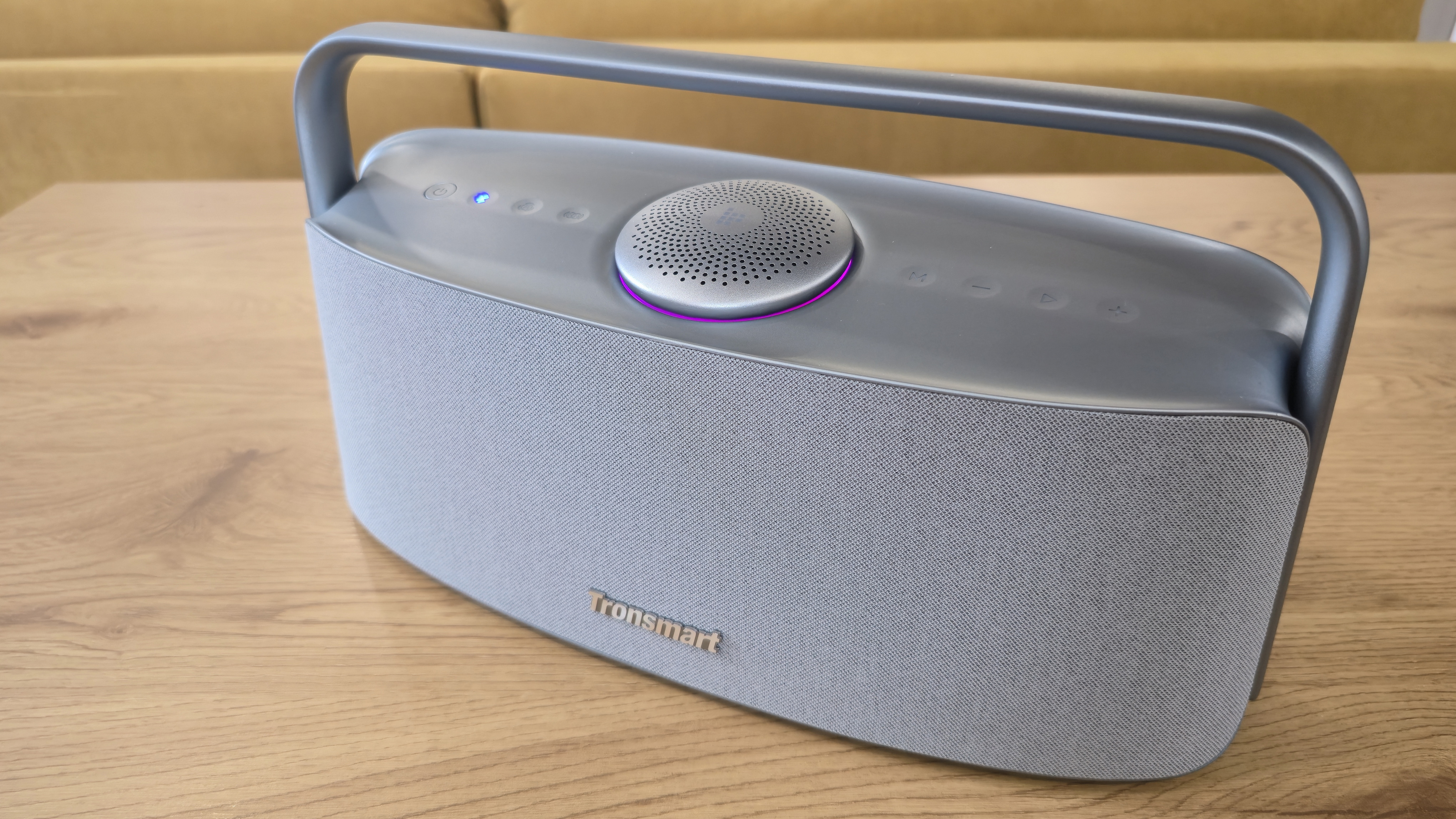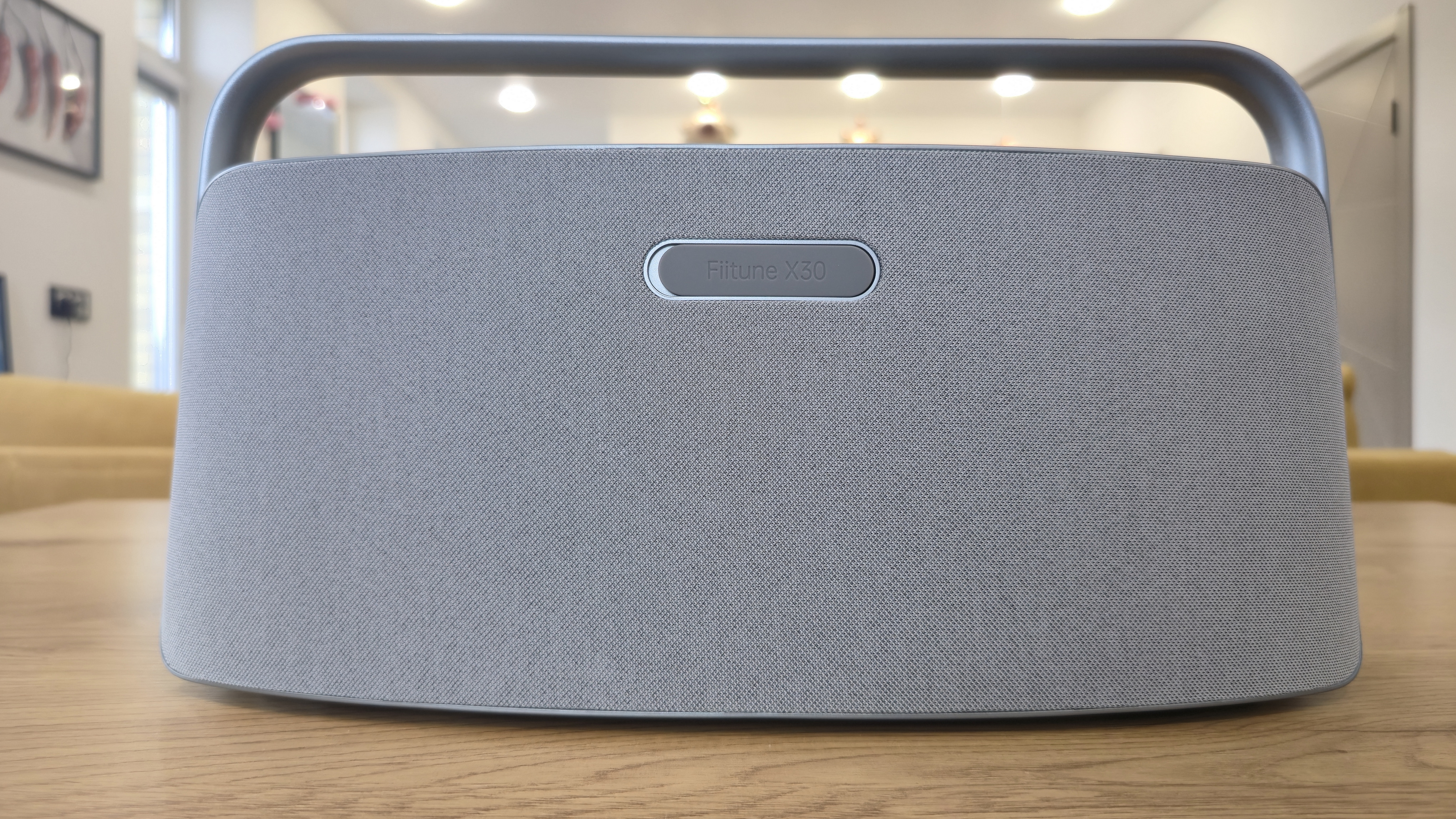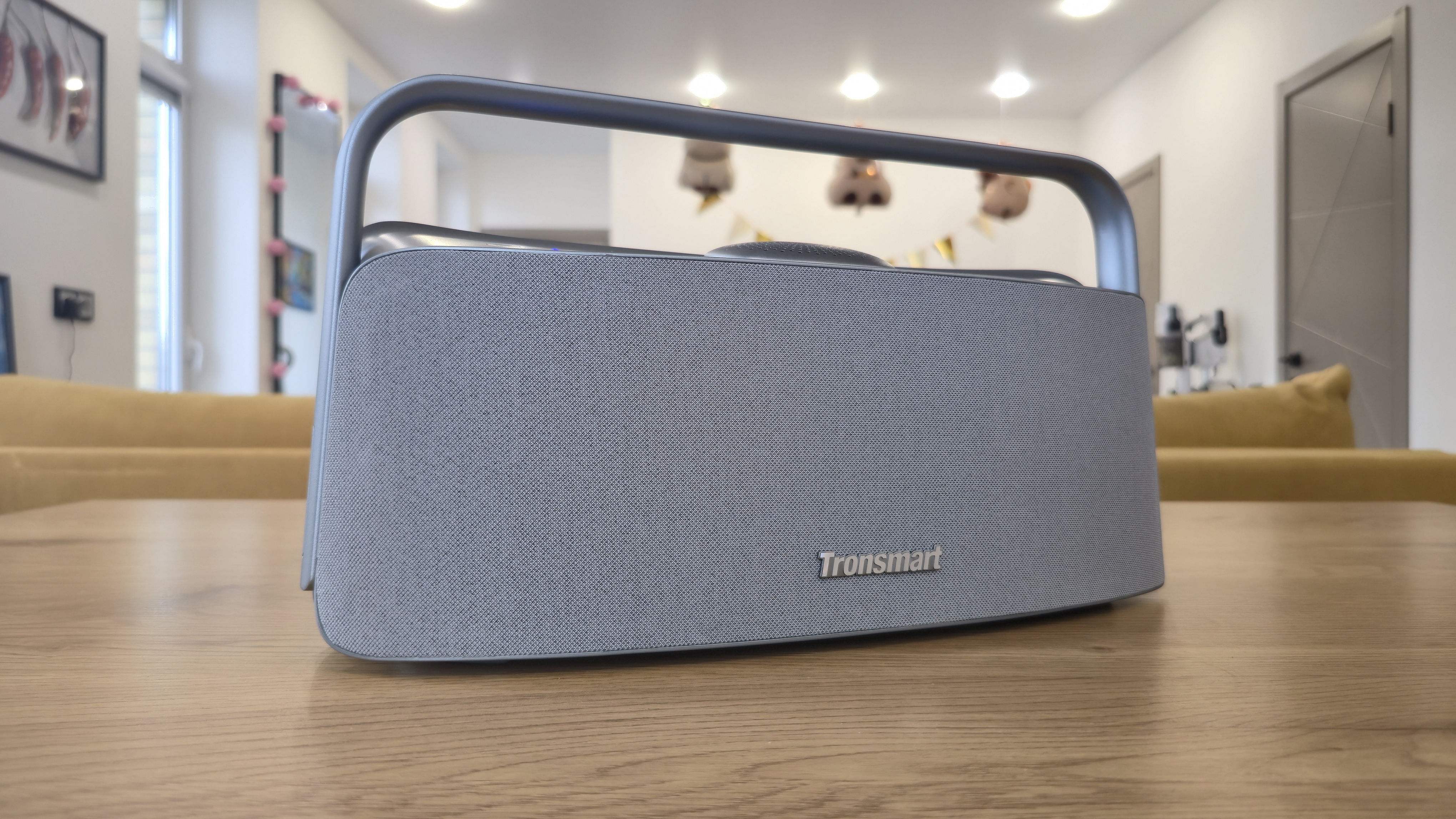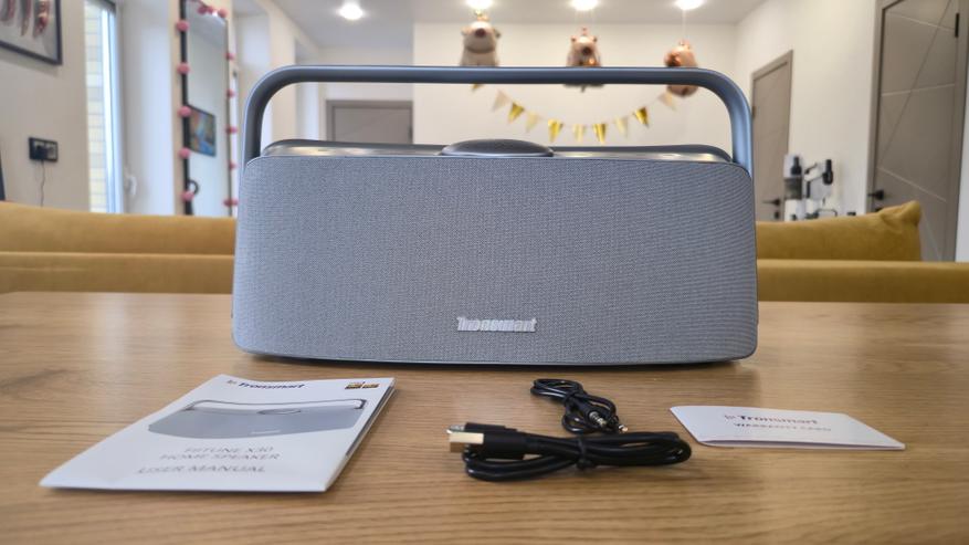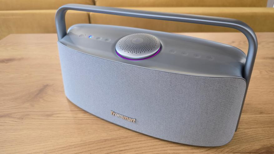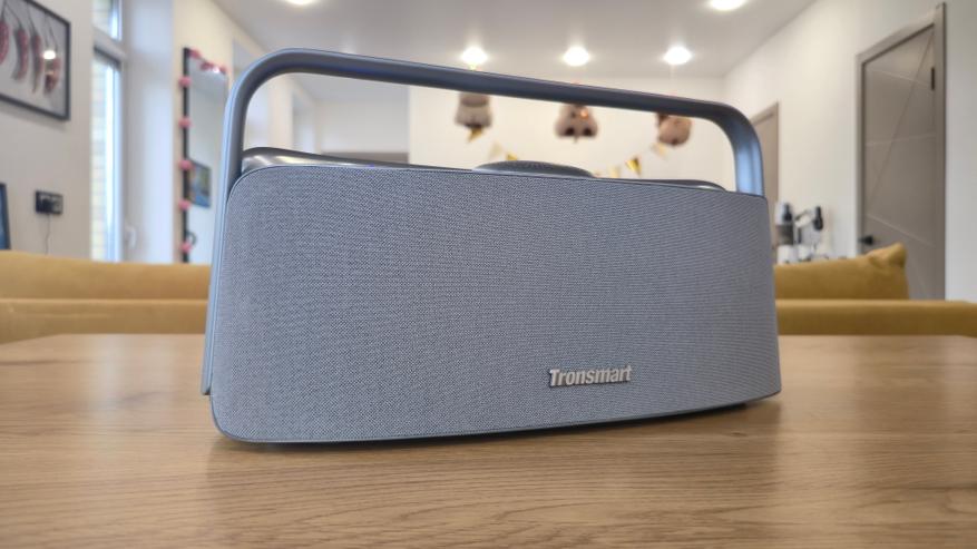 Корпус Tronsmart Fiitune X30 выполнен в прямоугольной форме с плавными закруглениями по углам. Почти вся передняя поверхность закрыта тканевой сеткой серого цвета, под которой расположены динамики. Сверху закреплена широкая алюминиевая ручка, она проходит через весь корпус.