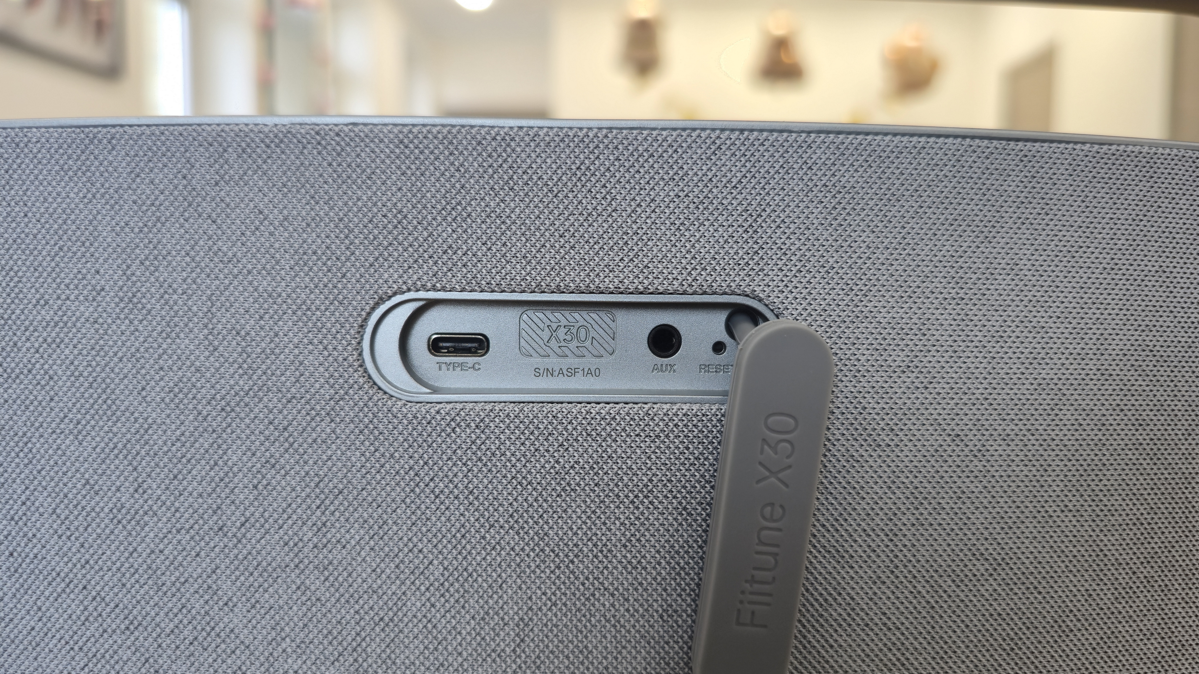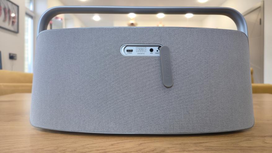 На задней стороне корпуса за тканевой вставкой скрывается небольшая панель с разъемами. Под защитной крышкой расположен порт USB-C для зарядки аккумулятора, рядом находится вход Aux для подключения кабеля 3.5 мм и маленькое отверстие для сброса настроек с помощью скрепки.