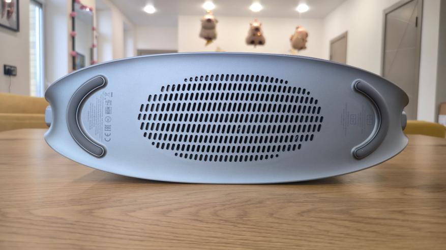 Нижняя часть корпуса также имеет сетчатую вставку, через которую работает встроенный сабвуфер овальной формы. Для устойчивости колонка опирается на прорезиненные ножки.