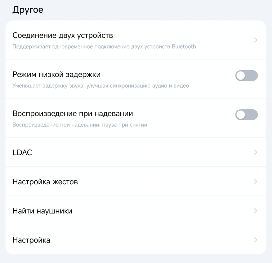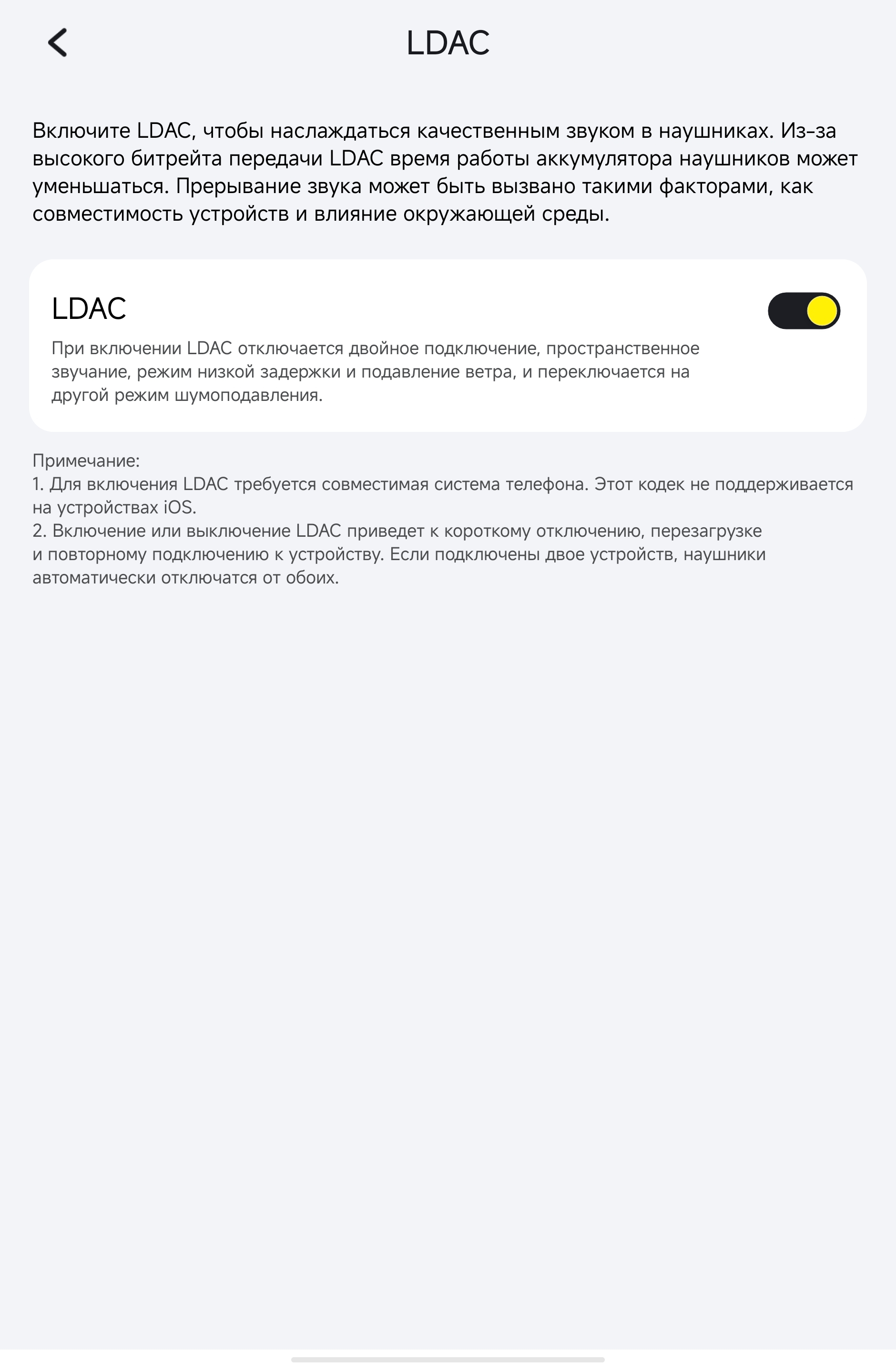 LDAC вынесен в отдельный раздел с честным предупреждением: при включении отключается мультиподключение, пространственный звук, режим низкой задержки и подавление ветра, батарея садится быстрее. Только Android, iOS не поддерживается.