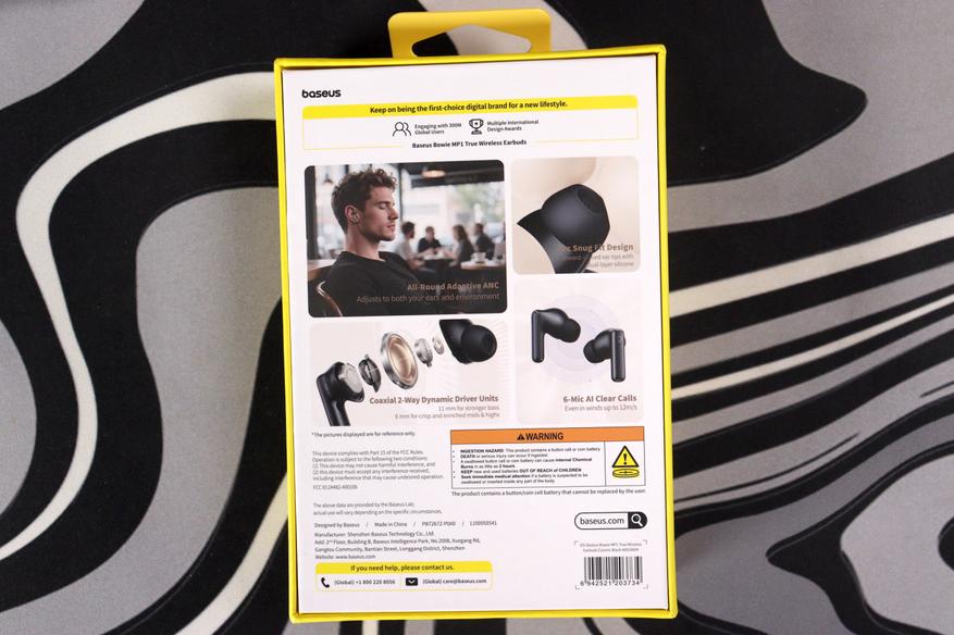 Коробка оформлена в фирменном стиле: белый фон, жёлтый логотип, минимализм без лишнего шума. На лицевой стороне — честный рендер устройства и ключевые характеристики прямо под картинкой: 11 мм + 6 мм коаксиальные драйверы, ANC −55 дБ, двухслойные силиконовые амбушюры, 6-микрофонная система. Ничего не спрятано мелким шрифтом — это уже располагает.