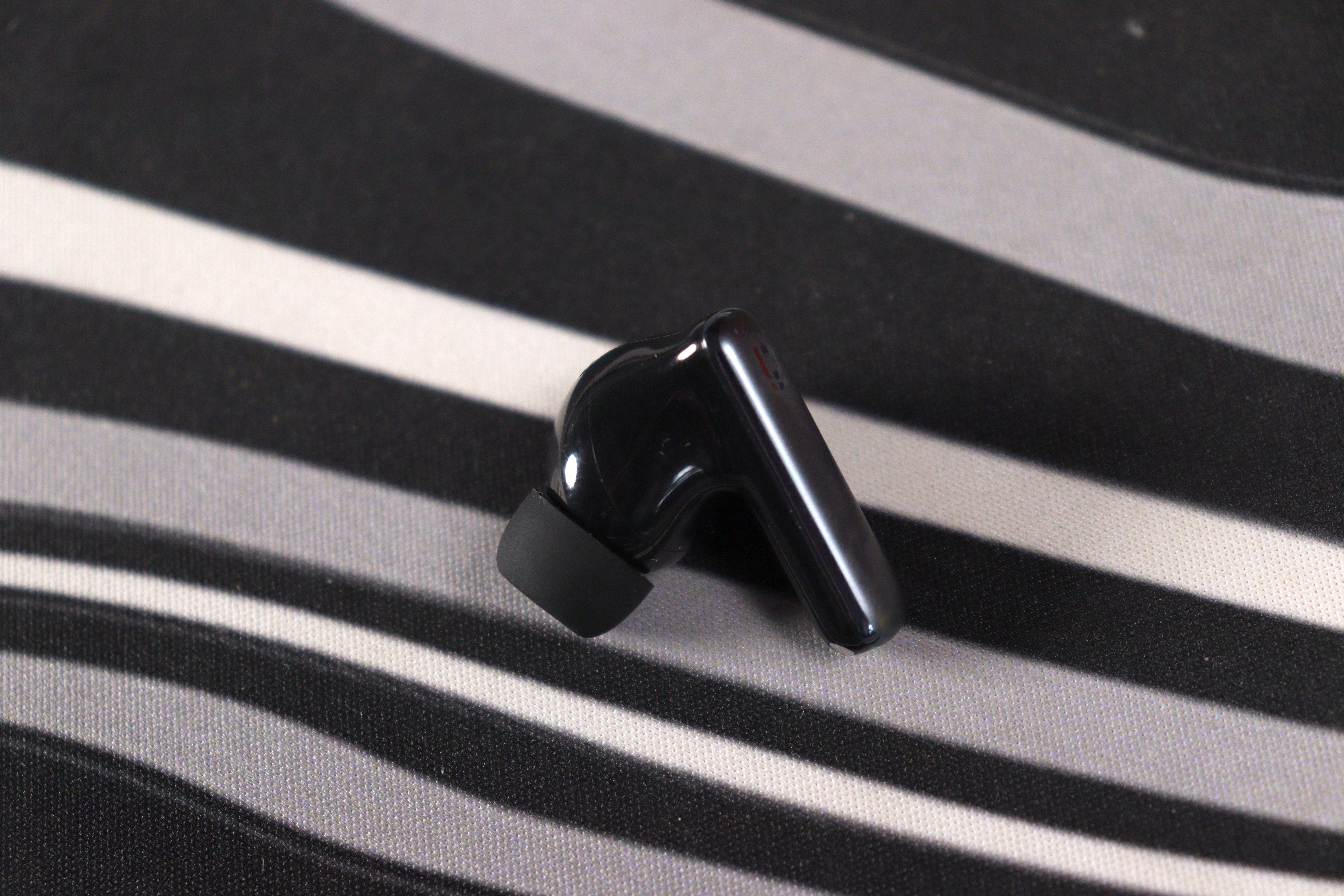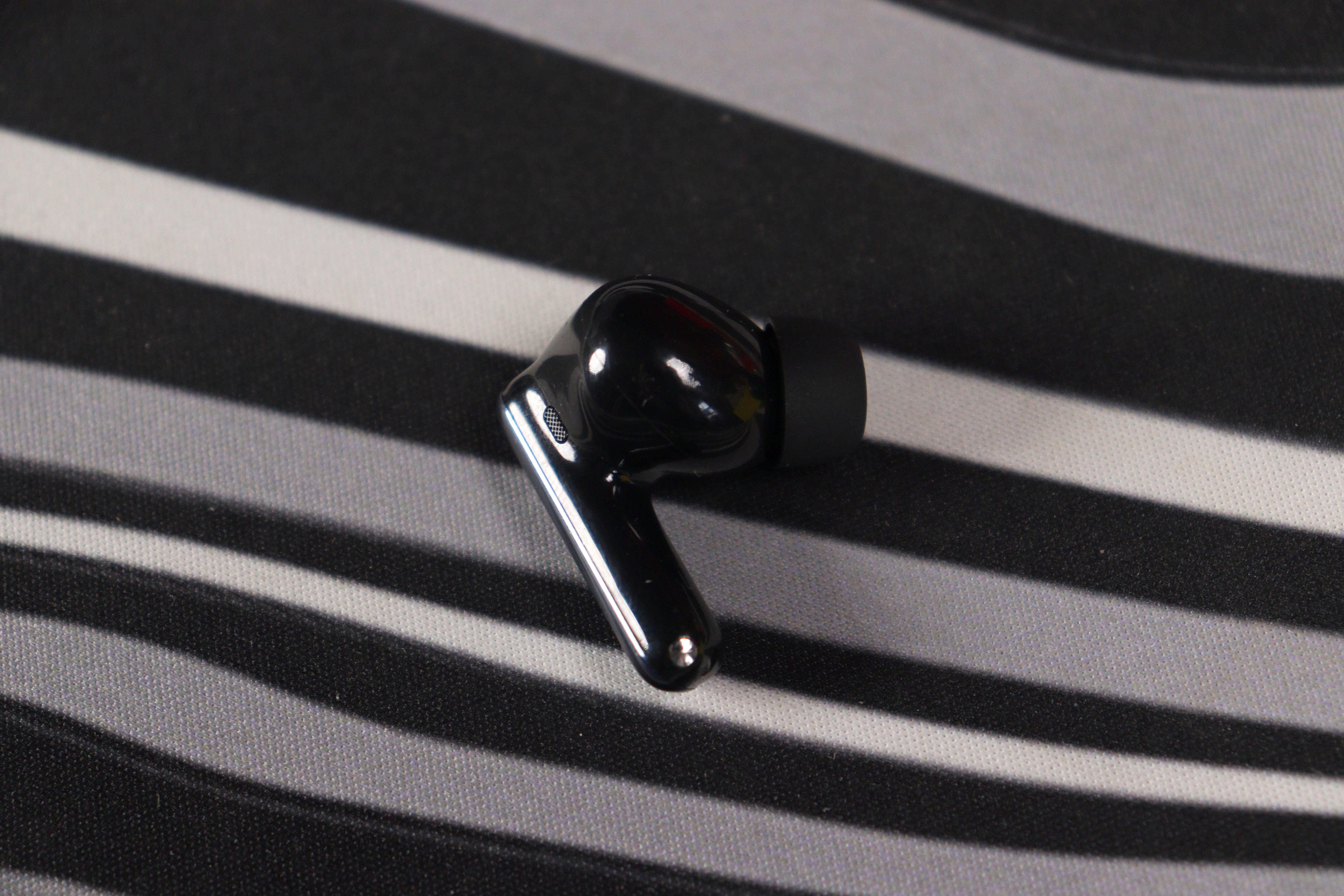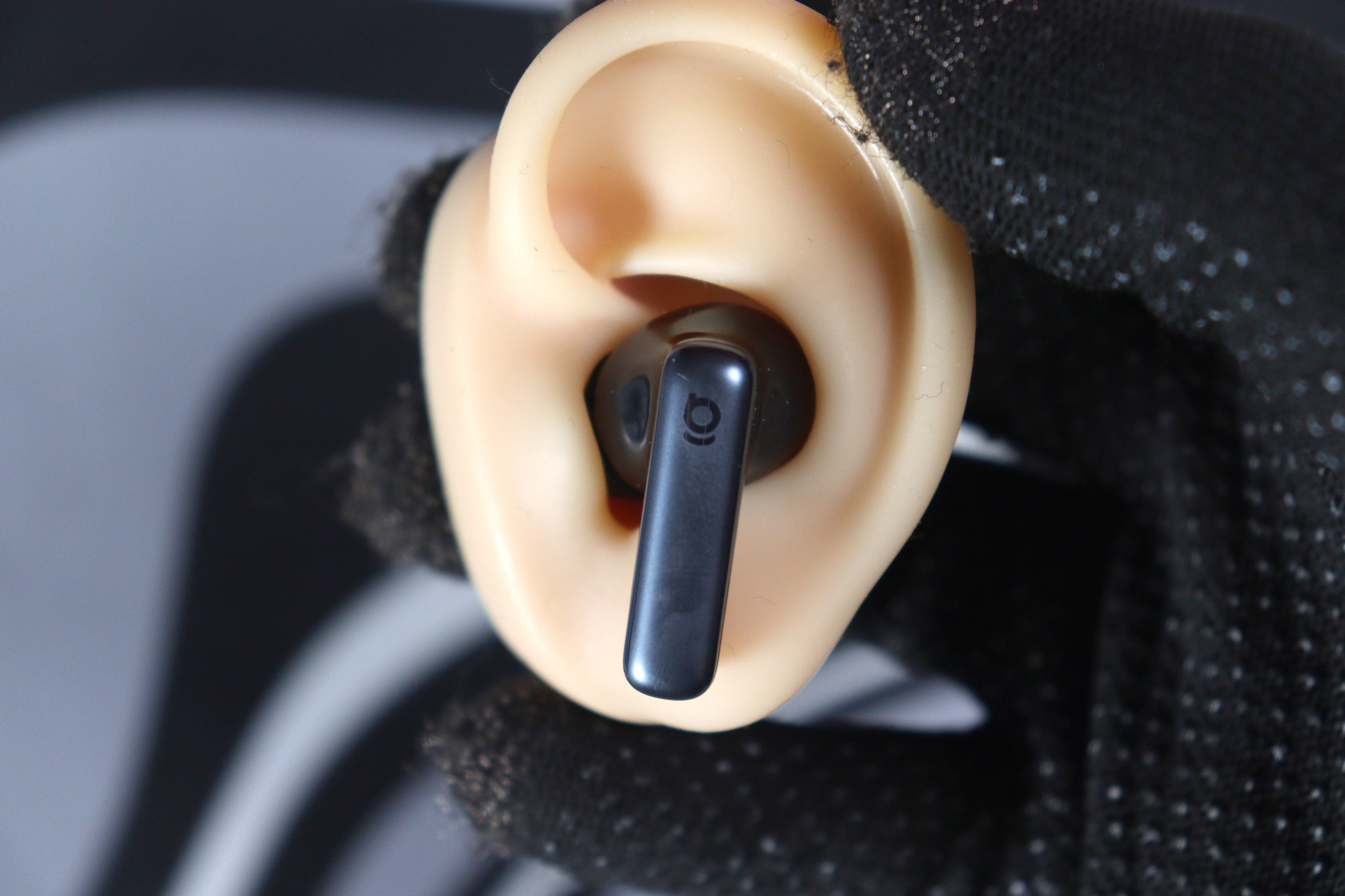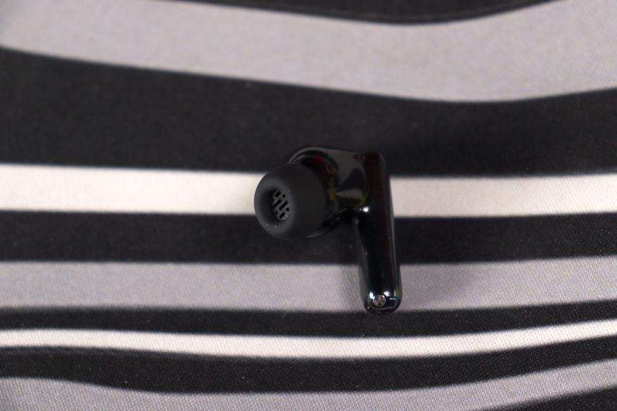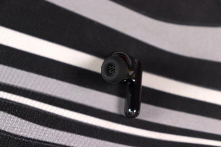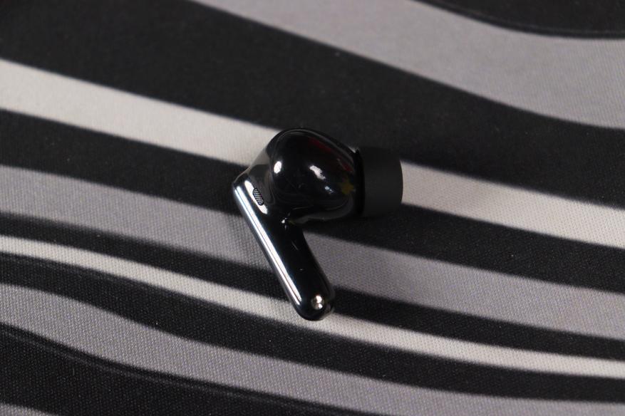 Сами наушники — форм-фактор «ножка», явно вдохновленная AirPods Pro, но с заметно более компактным корпусом. Двухтональное решение: матовая «голова» с анатомическим изгибом и глянцевая ножка-стебель. Звуковод направлен под углом — это грамотная анатомическая адаптация под ушной канал, а не просто прямая трубка. Компенсационное отверстие на корпусе присутствует — без него давление при плотной посадке было бы некомфортным. Два микрофонных отверстия на каждом наушнике расположены логично: фидбэк-микрофон ближе к уху, фронтальный — на ножке.