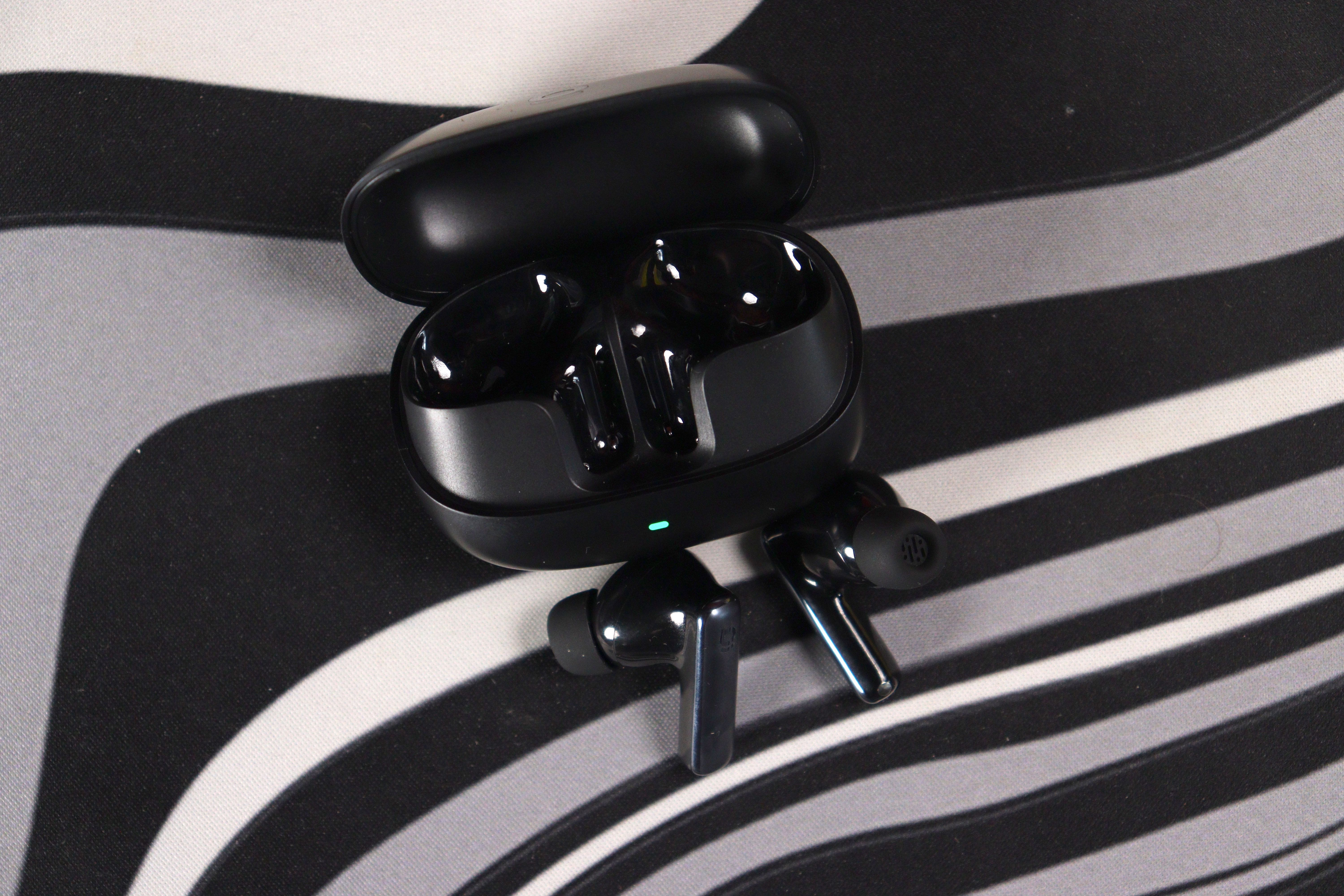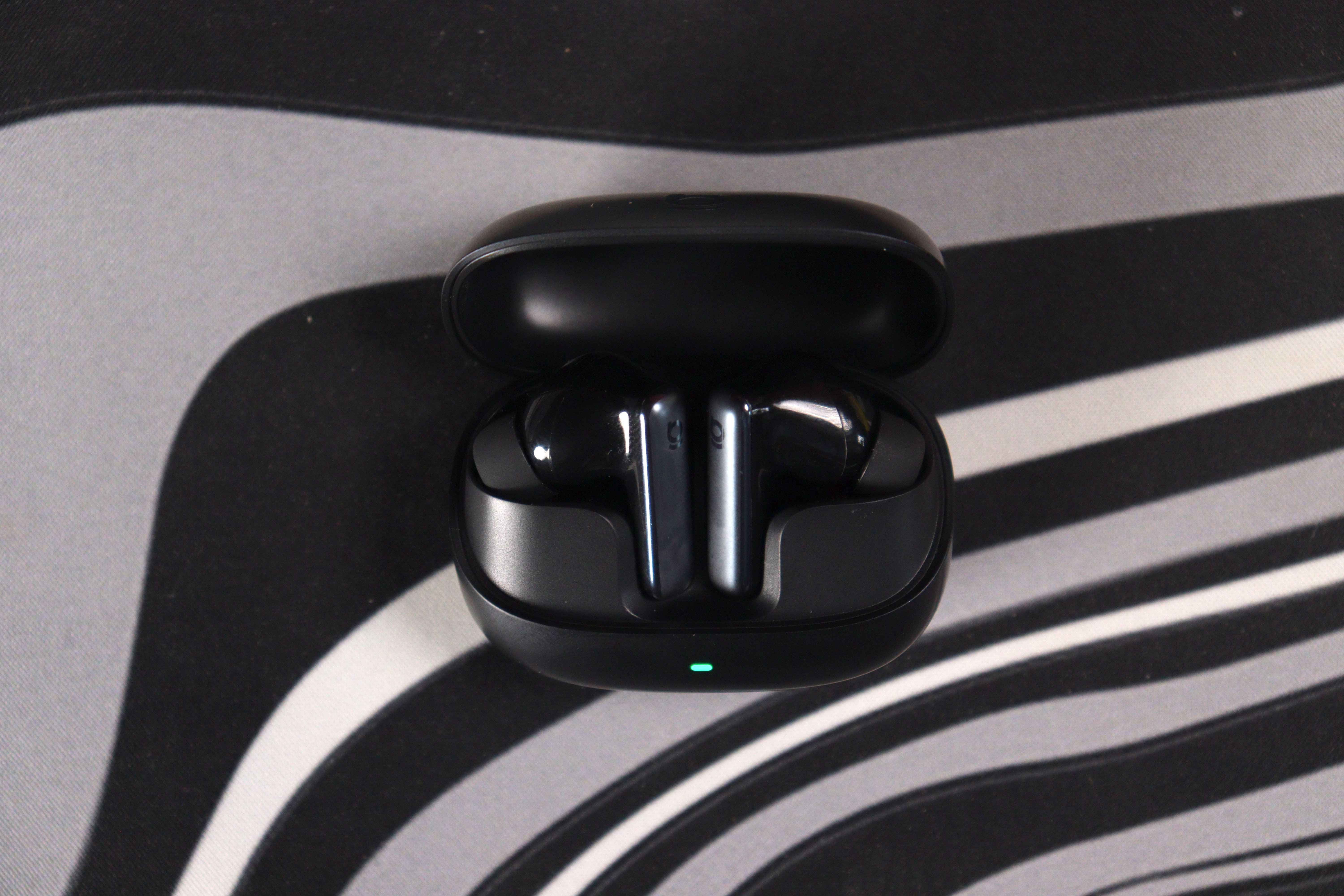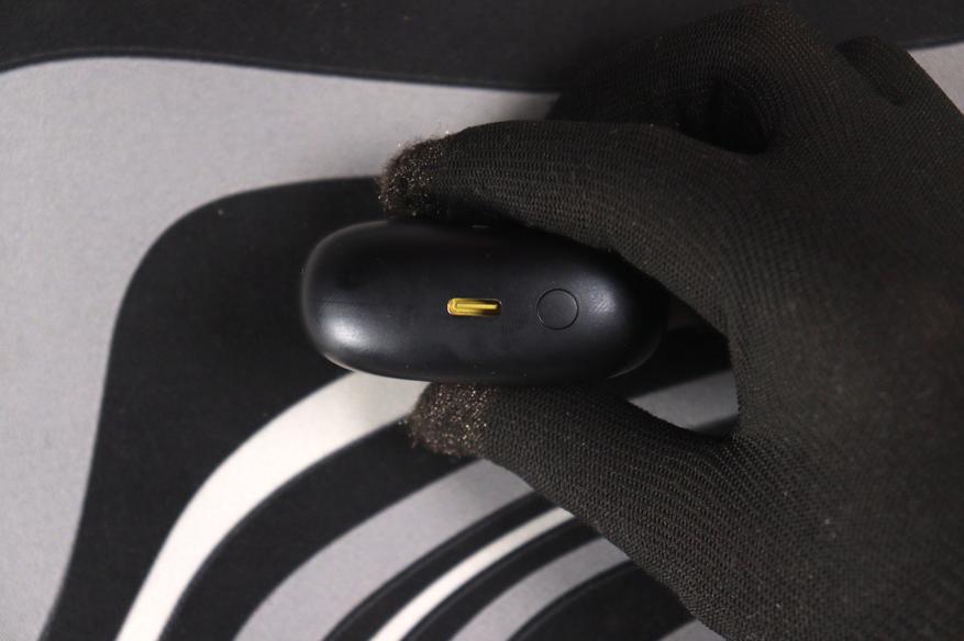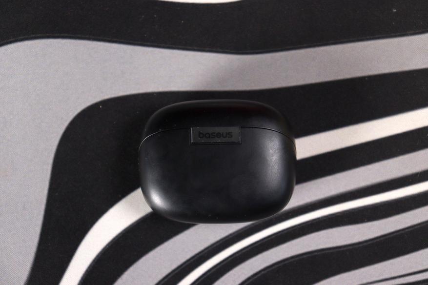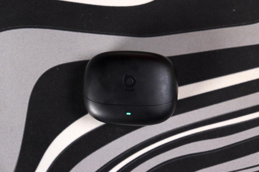 Кейс — скруглённый прямоугольник с мягкими радиусами, почти идеальная «галька». Покрытие матовое, поликарбонатное, приятное на ощупь. Минус, который бросается в глаза сразу: глянцевые поверхности внутри кейса и сами наушники собирают отпечатки пальцев моментально — это видно даже на снимках. На передней грани — одиночный LED-индикатор, горит зелёным при заряде. Практично, но один огонёк вместо полноценной батарейной шкалы — экономия там, где она ощущается. Порт зарядки USB-C на нижней грани смотрится чуть чужеродно: золотистый коннектор выбивается из общей чёрной стелс-гаммы кейса. Шарнир крышки работает плавно, открывается примерно на 120 градусов.