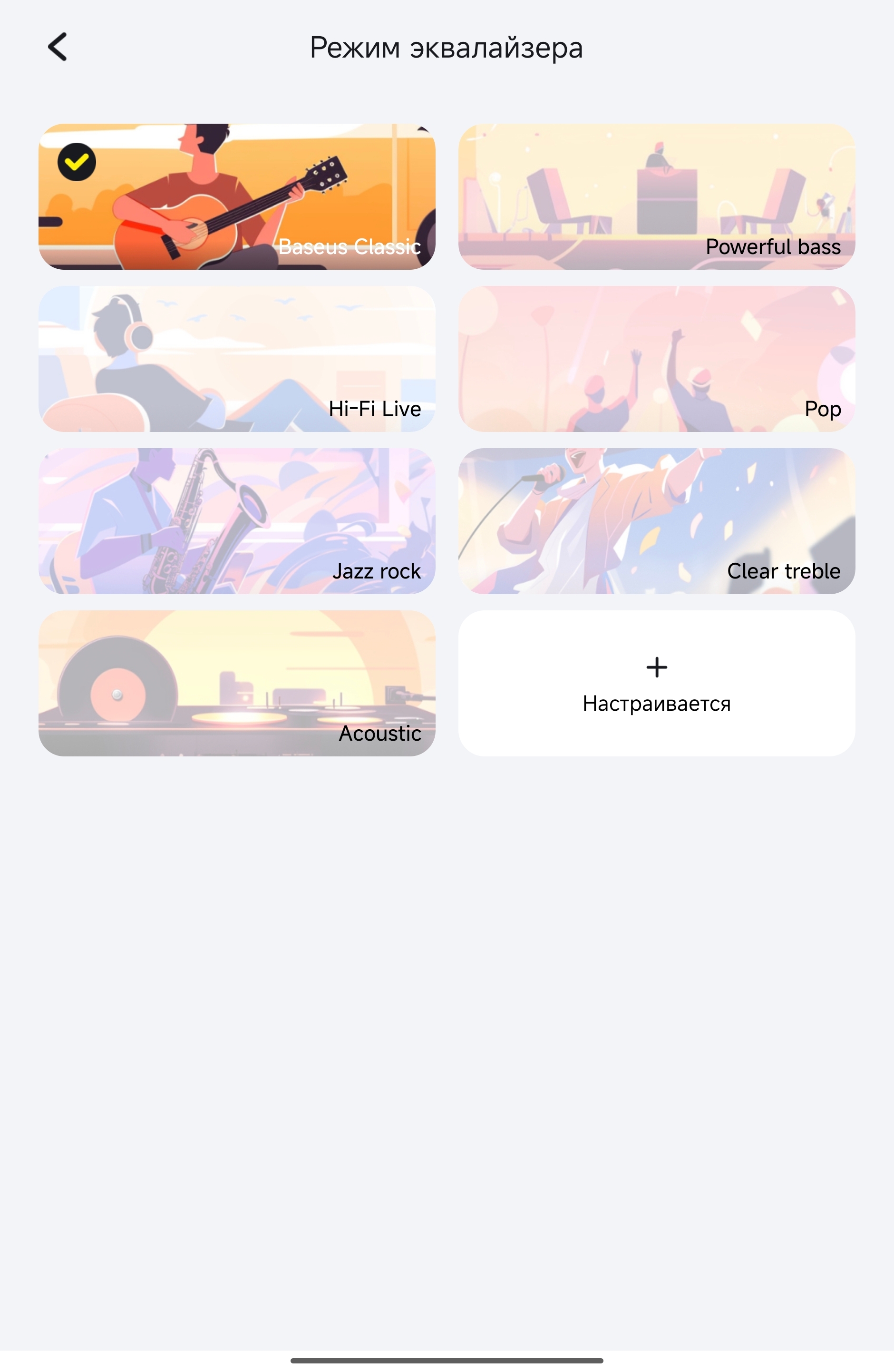 Эквалайзер восьмиполосный, +-6 дБ от 100 Гц до 10 кГц. Шесть готовых пресетов (Baseus Classic, Powerful Bass, Hi-Fi Live, Pop, Jazz Rock, Clear Treble, Acoustic) плюс слот для пользовательского. Отдельно вынесена функция SoundFit — персональная калибровка под слуховой профиль конкретного пользователя. В этой ценовой нише встречается нечасто.