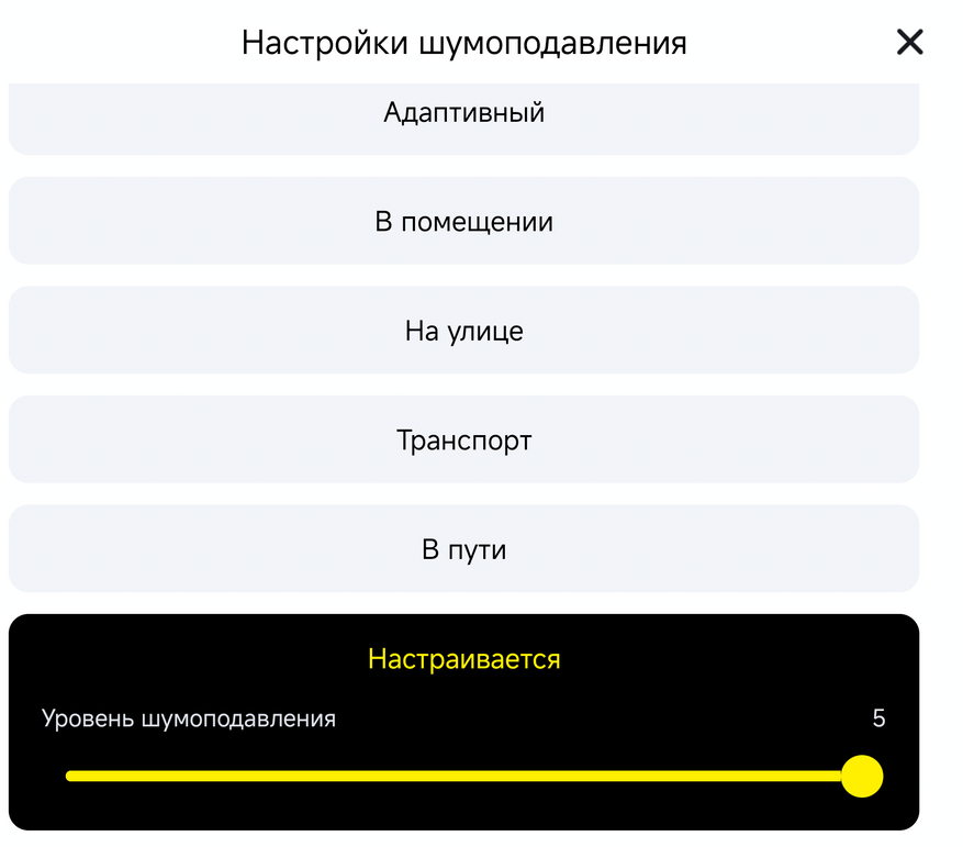 ANC здесь не просто «вкл/выкл». Есть отдельный раздел с пятью сценариями — адаптивный, в помещении, на улице, транспорт и «в пути» — плюс ручной слайдер уровня от 1 до 5. Это редкость даже у брендов ценой вдвое дороже.
