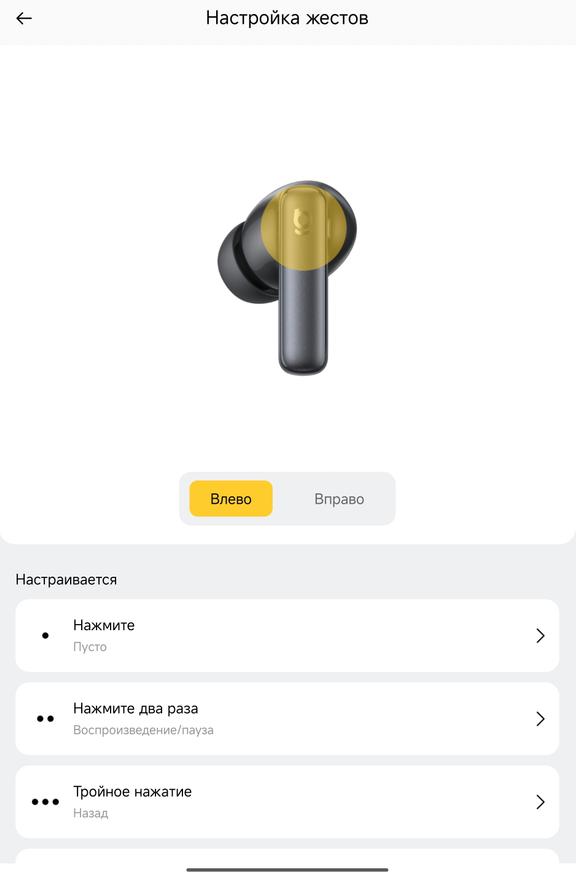 Управление жестами полностью переназначаемое — одиночное, двойное и тройное касание для каждого наушника отдельно. По умолчанию одиночное нажатие пустое, двойное — воспроизведение/пауза, тройное — назад.