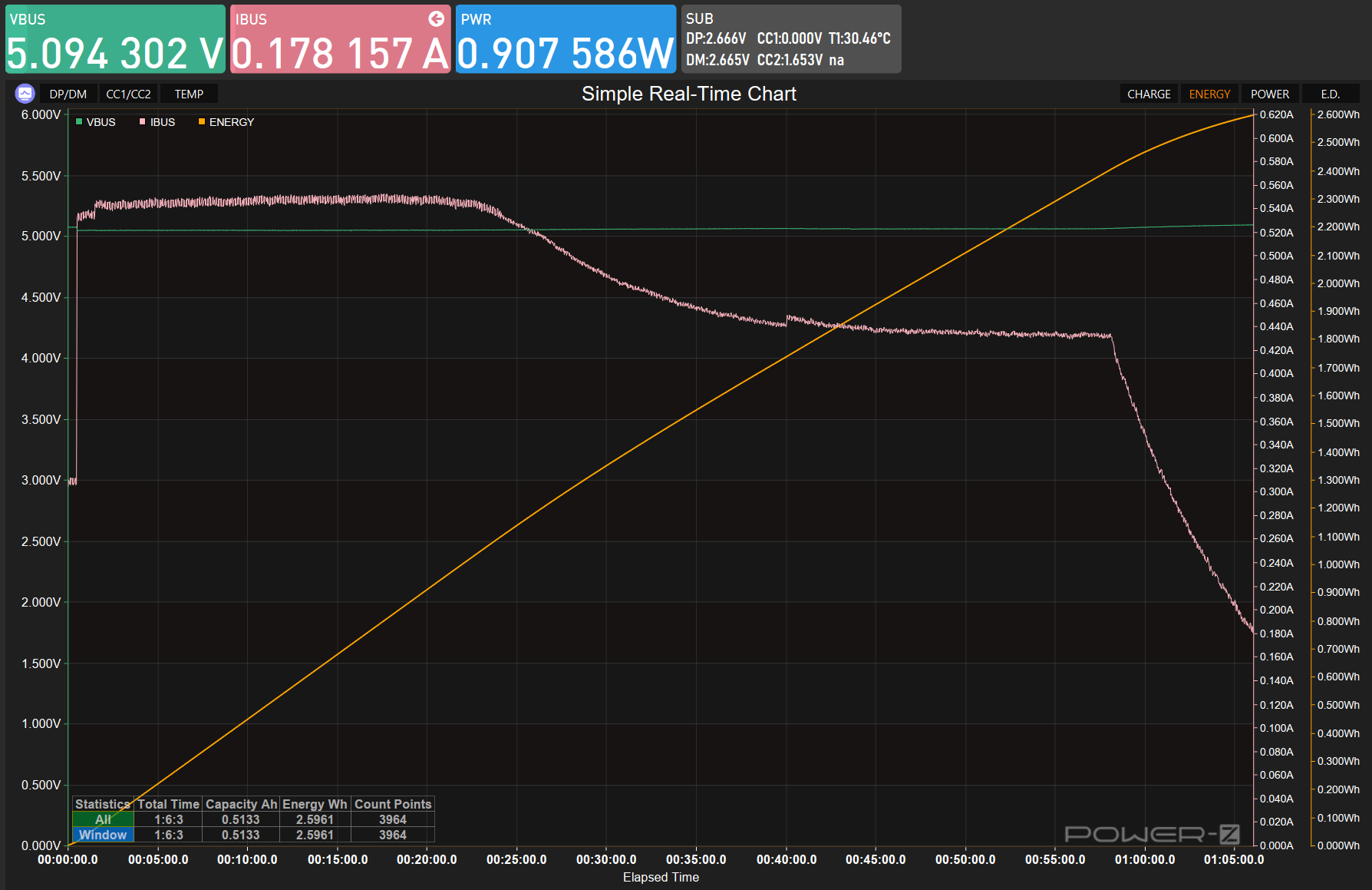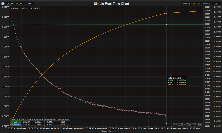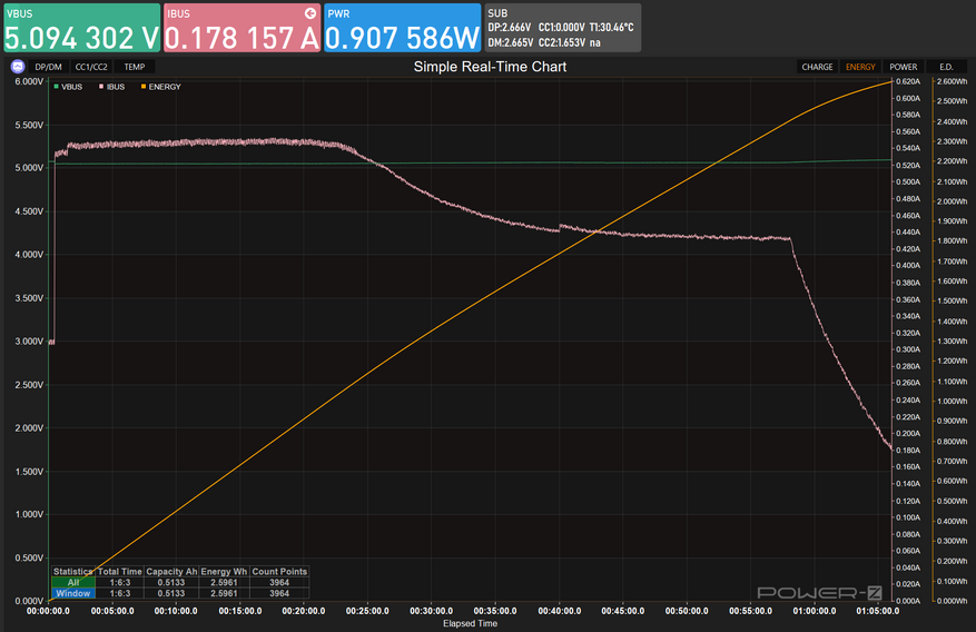 Зарядка кейса заняла около 1 часа 20 минут, суммарная ёмкость 2,71 Втч. Кривая напряжения держится на уровне ~5,1-5,2 В первые 25 минут, затем плавно проседает — стандартное CC/CV-поведение для литий-ионного аккумулятора. Никакого PD, входная мощность около 0,9 Вт — кейс заряжается от любого стандартного USB 5V без претензий.