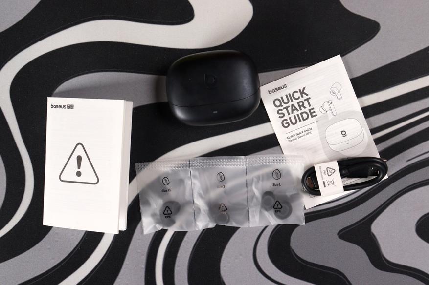 Внутри всё аккуратно разложено: кейс с наушниками, кабель USB-C, четыре пары сменных амбушюров (S, M предустановлен, L и XL в отдельных пакетиках) и буклет с предупреждениями. Четыре размера насадок из силикона — это уже не стандартный минимализм «три пары и хватит», а реальная забота о подборе посадки.