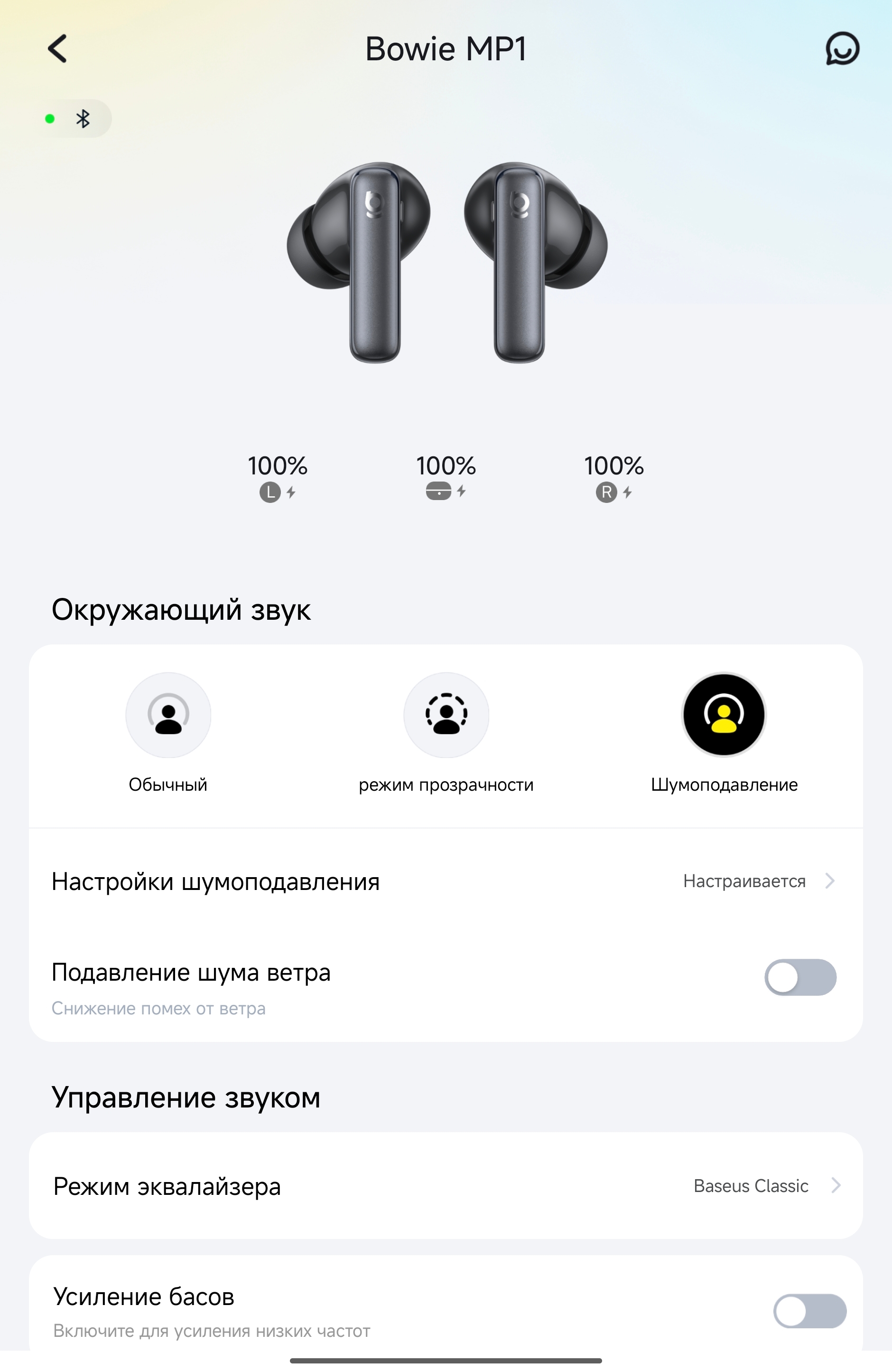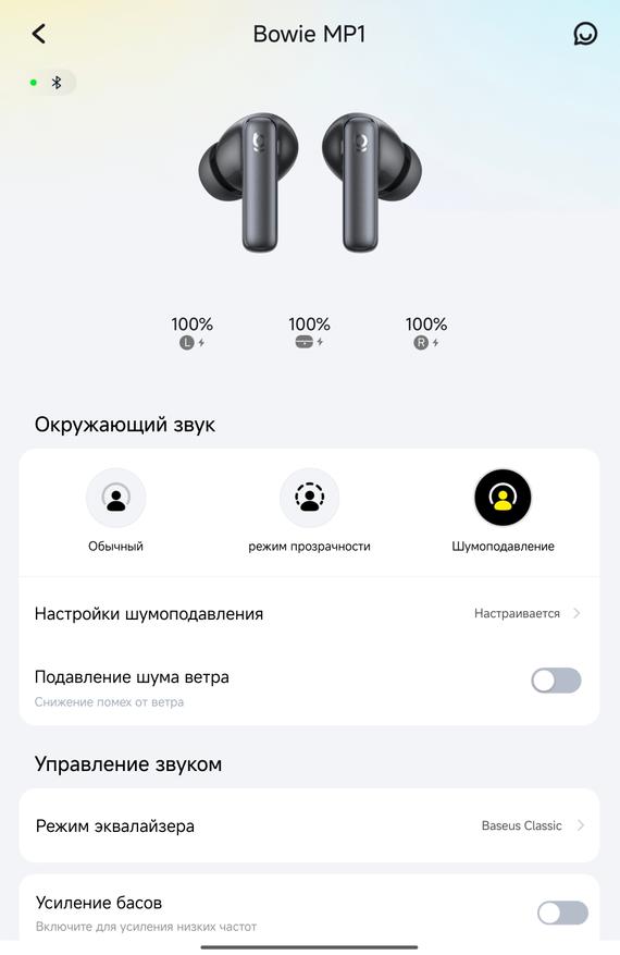 Здесь всё неожиданно серьёзно. На главном экране сразу видны три значения заряда: левый наушник, правый, кейс — как и должно быть у приличных TWS.