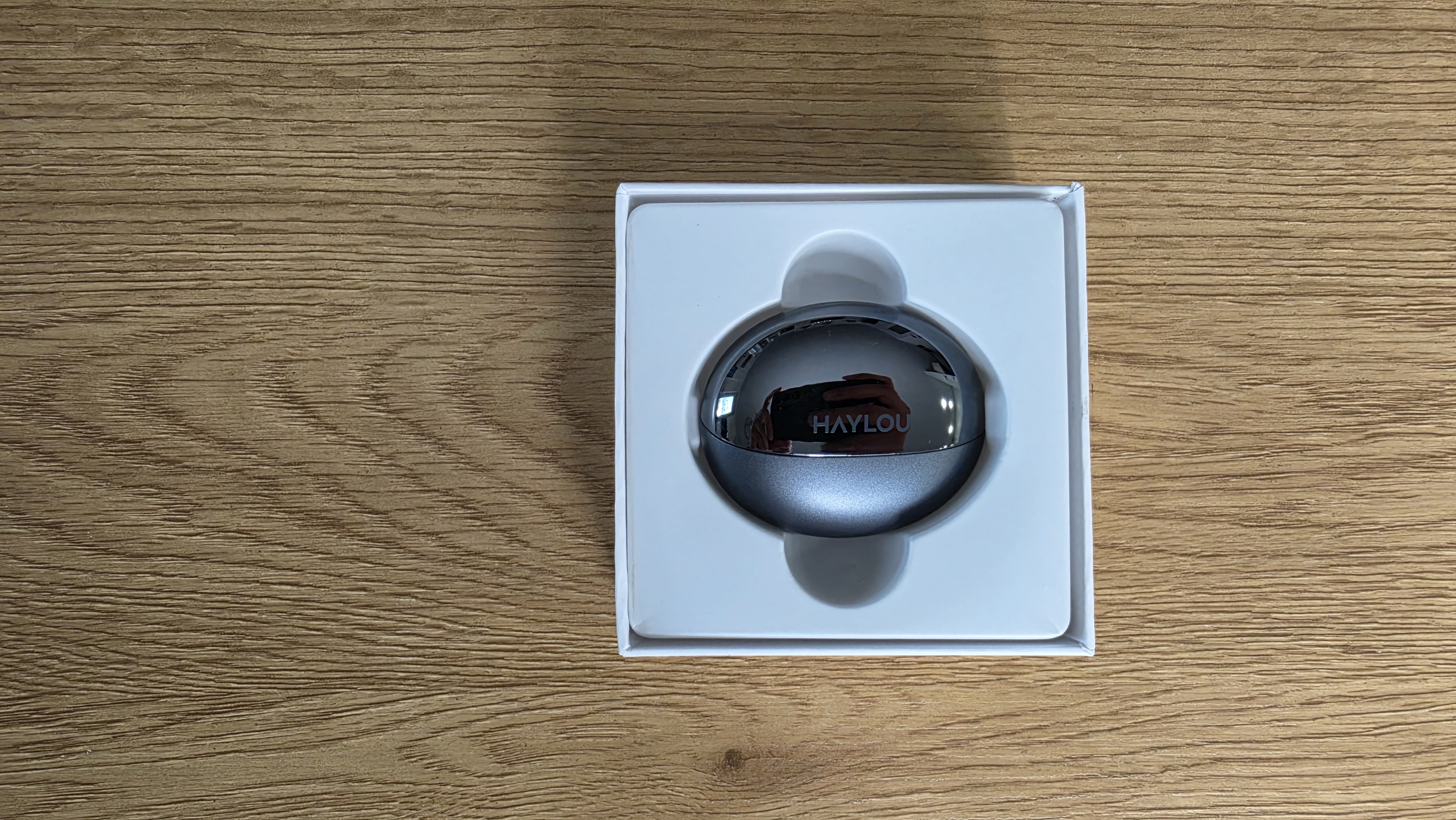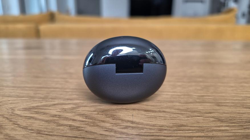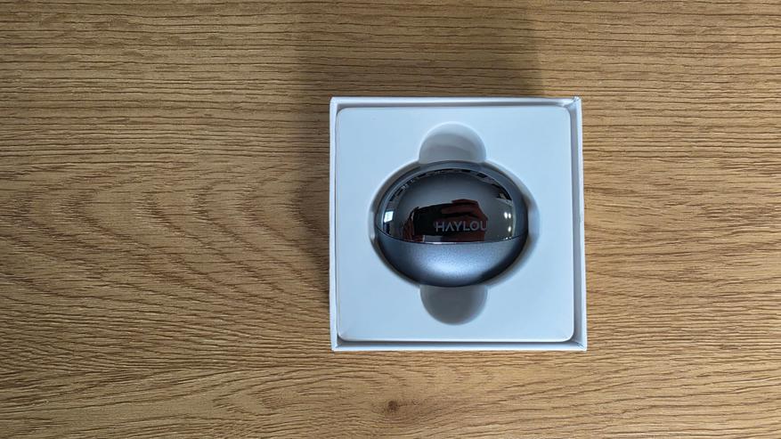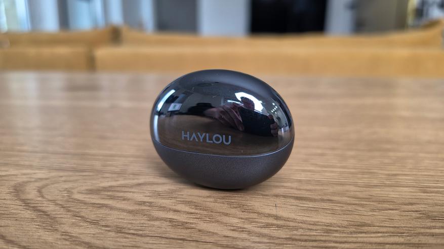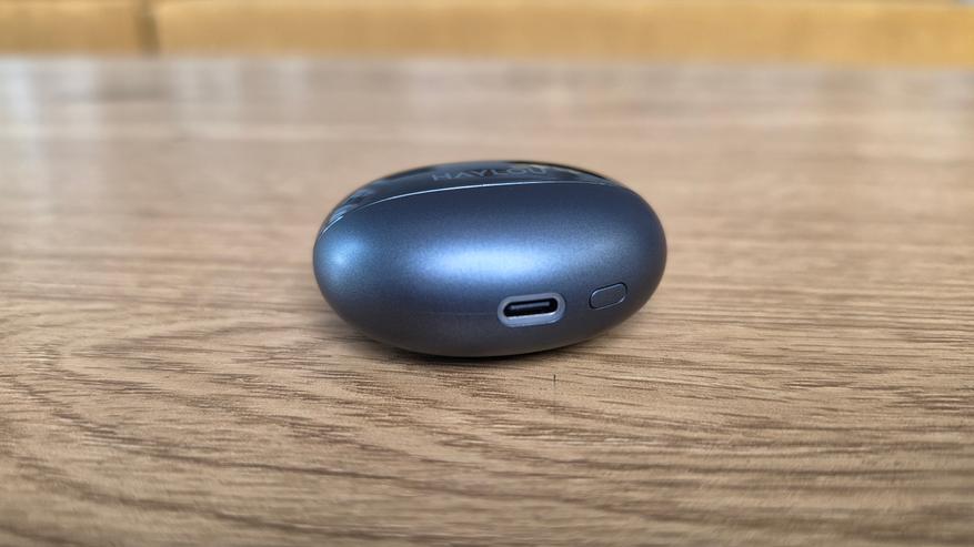 Кейс компактный, округлый, по форме ближе к капсуле. Верхняя часть глянцевая, с логотипом HAYLOU, нижняя — матовая. За счет этого он не выглядит плоским, но глянец быстро собирает отпечатки. В закрытом виде выглядит аккуратно. Снизу расположен USB Type-C, рядом индикатор и кнопка для сопряжения.
