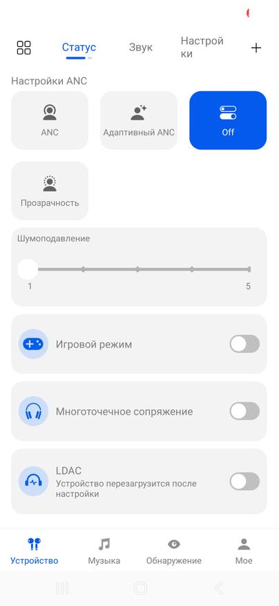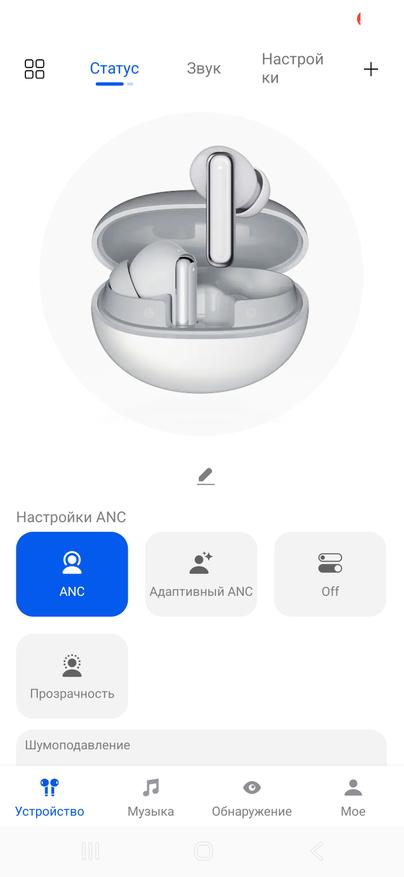 Шумоподавление адаптивное. Заявлено до 54 дБ, но это пиковое значение. Система работает в нескольких режимах: обычный ANC, адаптивный режим и прозрачность. В приложении можно менять интенсивность шумоподавления по уровням. Отдельно реализован контроль давления в ушах, чтобы снизить ощущение вакуума при работе ANC.