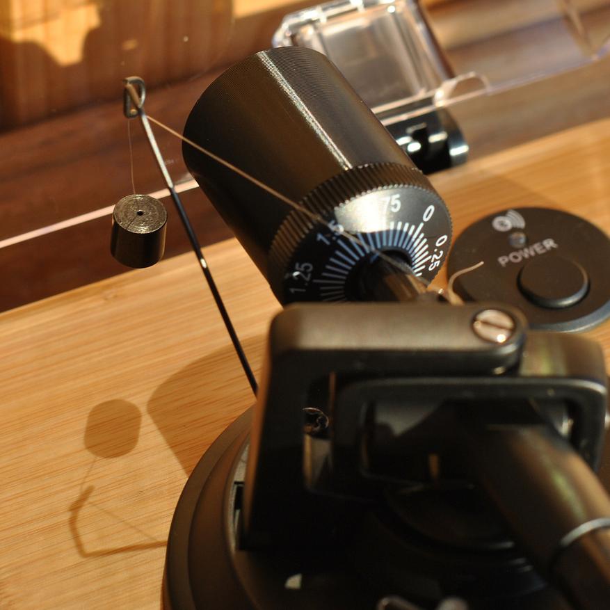 Скобы привода металлические, крышка из пластика, есть винты для выбора люфта (которого и не было). Сила антискейтинга (от 1 до 2 г) может быть настроена путем перемещения точки крепления комплектного груза с леской ближе или дальше от оси на тонарме (предусмотрено всего четыре положения). Как по мне, удобнее, когда это спрятано под узел тонарма, а пользователю предоставлена только рукоятка с цифрами.
