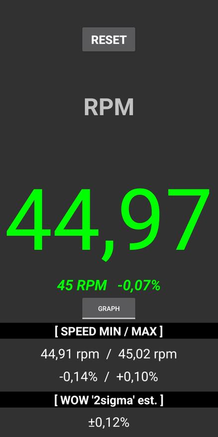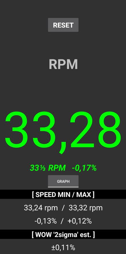 Проверим скорости вращения опорного диска (мобильное ПО RPM Speed & Wow и гироскоп смартфона):