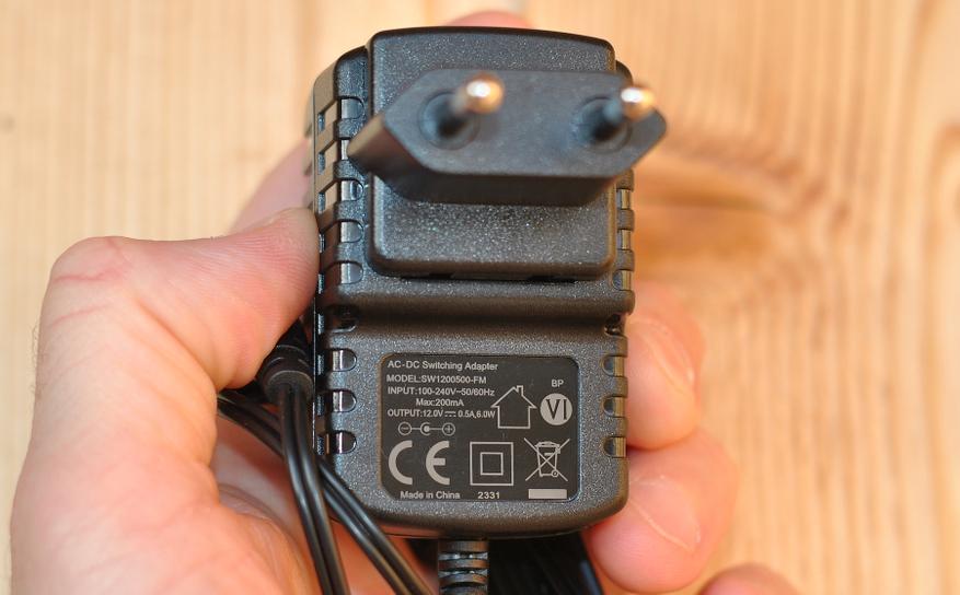 Диапазон входного напряжения очень широк: от 100 до 240 В переменного тока. На конце кабеля находится цилиндрический разъем размерности 5,5х2,1 мм.