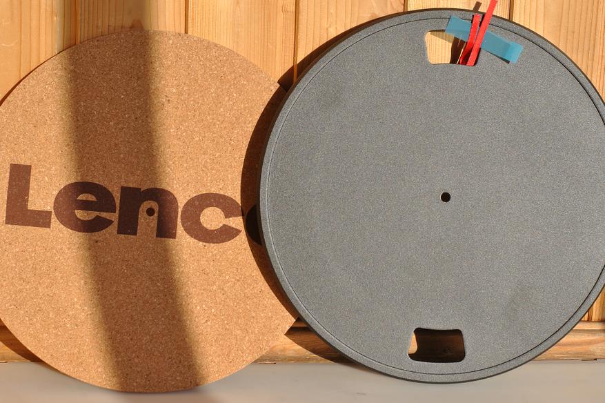 Опорный диск из алюминиевого сплава (размера под пластинки 12″), не очень тяжелый (0,55 кг), но не дает заметного осевого и торцевого биения. На нем установлен резиновый приводной ремень шириной 5 мм. Посадка диска на бронзовый конус. Слипмат из натуральной пробки толщиной 3 мм неплохо сглаживает неровности пластинок.