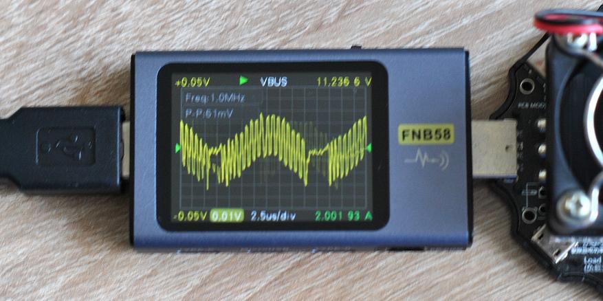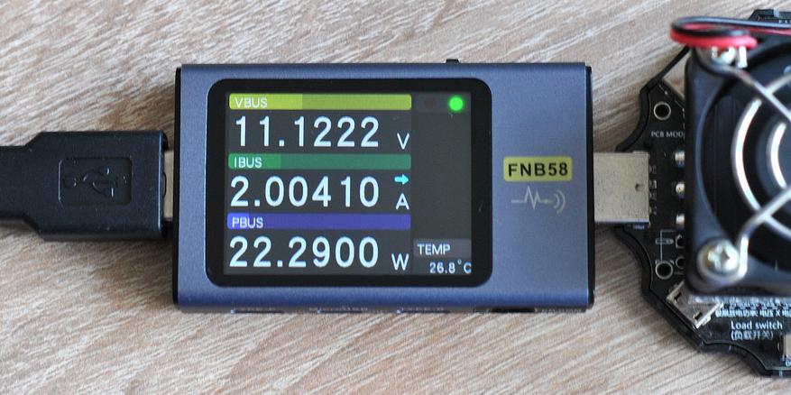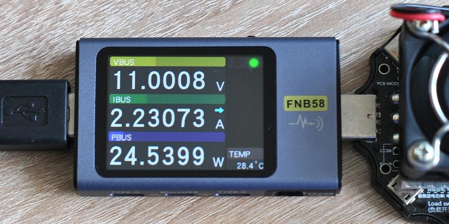 Заявленные параметры 24 Вт при напряжении 12 В, проверим это с помощью точного USB-тестера и регулируемой нагрузки: