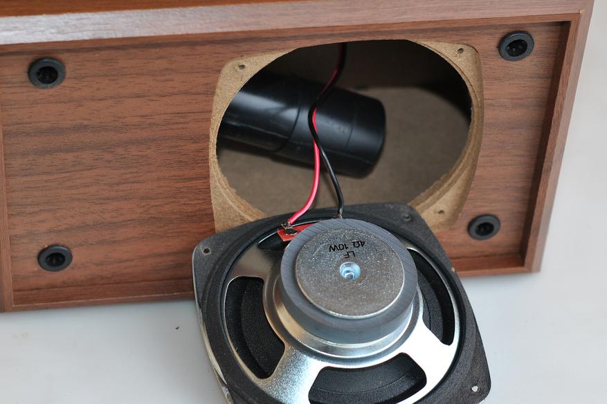 Динамик с параметрами 4 Ом и 10 Вт, с ферритовой магнитной системой и невентилируемым керном. Трубка ФИ довольно длинная, чтобы настроить фазоинвертор как можно ниже в таком небольшом корпусе (~2 литра внутреннего объема), выходы кабелей и динамик герметизированы, звукопоглощения внутри нет.