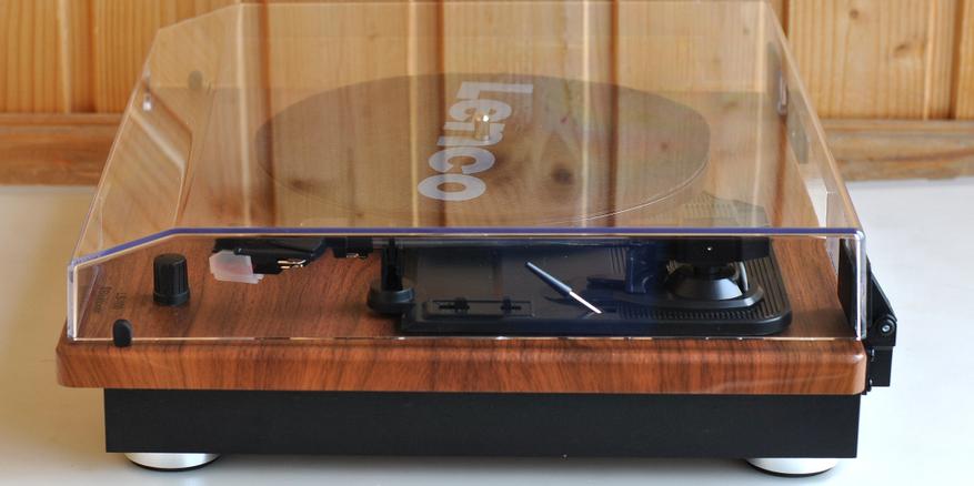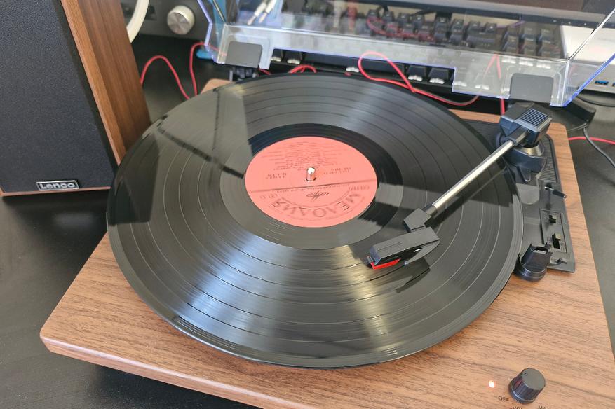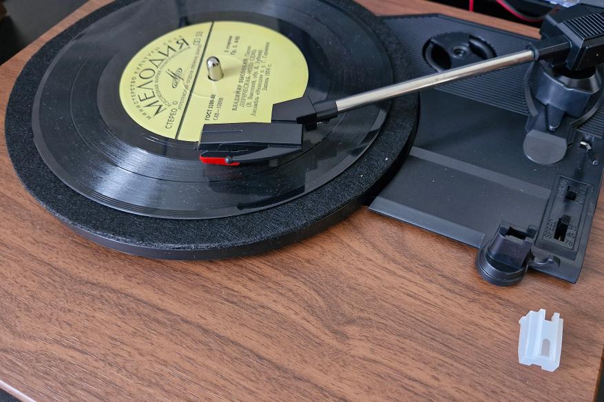 Несмотря на скромные размеры проигрывателя и стола, обычные пластинки 12″ проигрываются без проблем. В конце двигатель останавливается. Звукосниматель с дорожки не соскакивает, и у него удобная рукоятка для направления на трек.