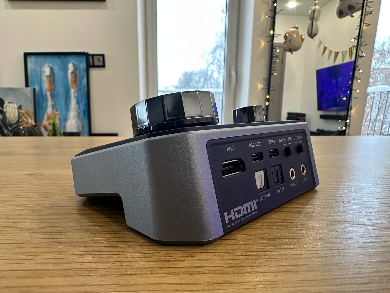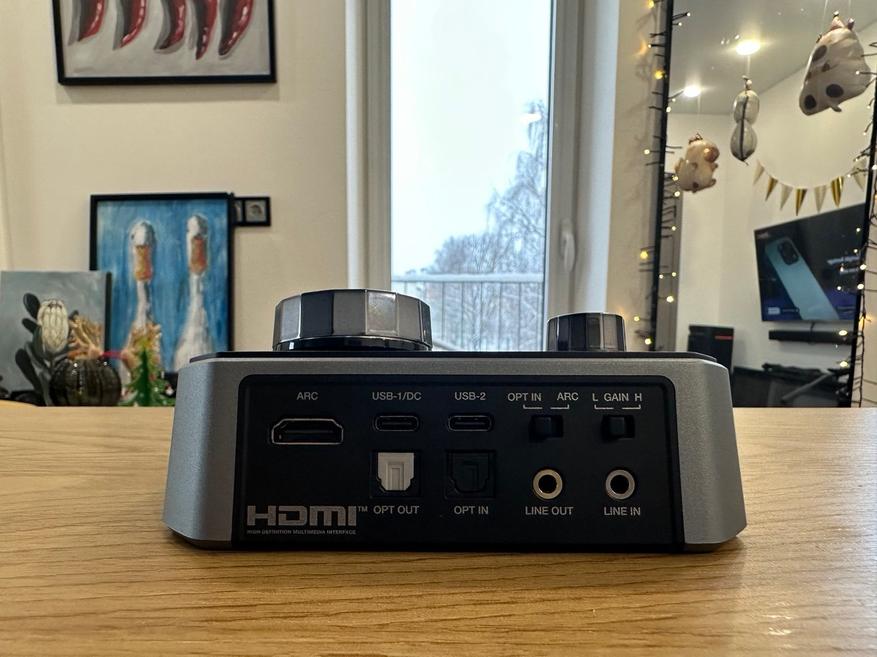 Сзади сосредоточены все подключения. Слева HDMI ARC. Дальше два USB Type-C, они подписаны USB-1 DC и USB-2. Ниже оптические разъемы OPT OUT и OPT IN. Справа линейные разъемы LINE OUT и LINE IN на 3.5 мм. Рядом с ними два переключателя: один для выбора источника OPT IN или ARC, второй для усиления, с подписями L GAIN и H.