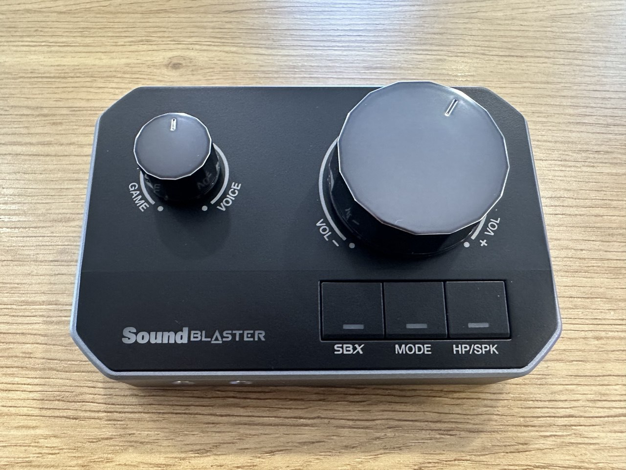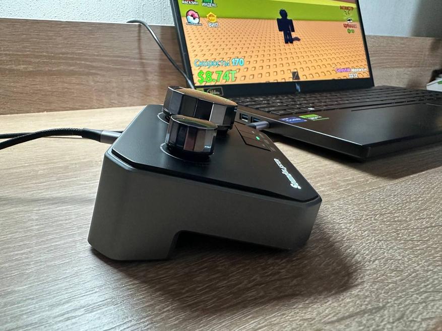На верхней панели два поворотных регулятора. Большой отвечает за громкость, он с гранями, его удобно крутить пальцами, даже когда смотришь в экран и не отвлекаешься. Второй, меньший, подписан как GAME и VOICE, по нему понятно назначение: он нужен для баланса между звуком игры и голосом.