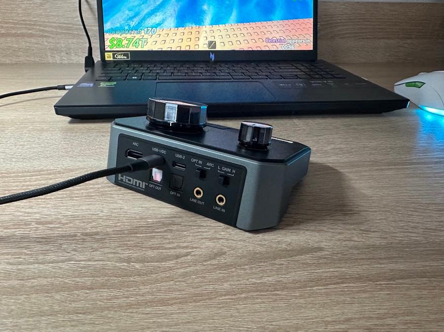 Одна из главных фишек здесь — два порта USB Type-C. Их смысл в том, что можно подключить два источника и использовать карту как точку сведения звука. Это удобно, когда параллельно идут игра и общение, или когда нужен гибкий вариант для стрима без отдельного микшера. Важно, что идея именно в параллельной работе, а не в «перетыкать кабель туда сюда».