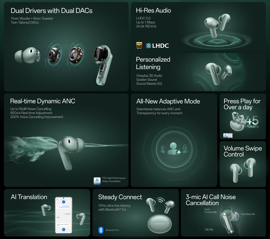 Особое внимание производитель уделяет качеству звучания OnePlus Buds 4, заявляя о лучшем в своем классе качестве благодаря кодеку LHDC 5.0. Этот кодек предназначен для передачи аудио высокого разрешения, обеспечивая звук без потерь с частотой дискретизации 24 бит/192 кГц.