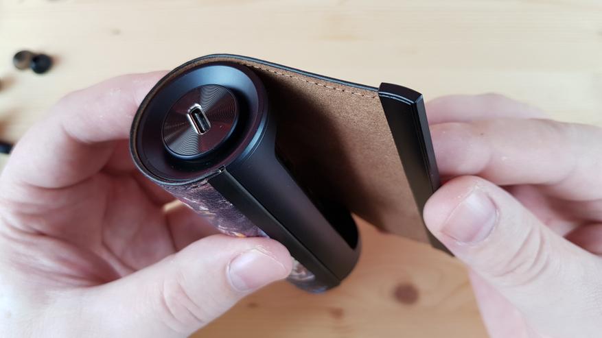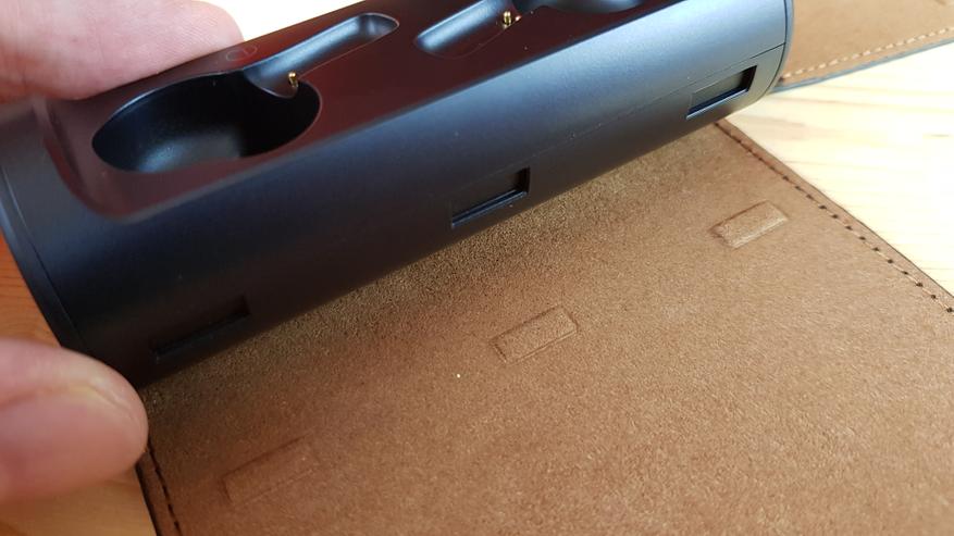 Ну а поскольку изменилась конструкция кейса, то и светодиоды переехали. Теперь они располагаются на правом торце. Признаюсь, поначалу мне показалось что кейс выполняет роль еще и блютуз колонки и я готов был плясать от счастья, так мне понравилась идея. Но, по факту, это только стилизация и там скрываются лишь индикаторные диоды.