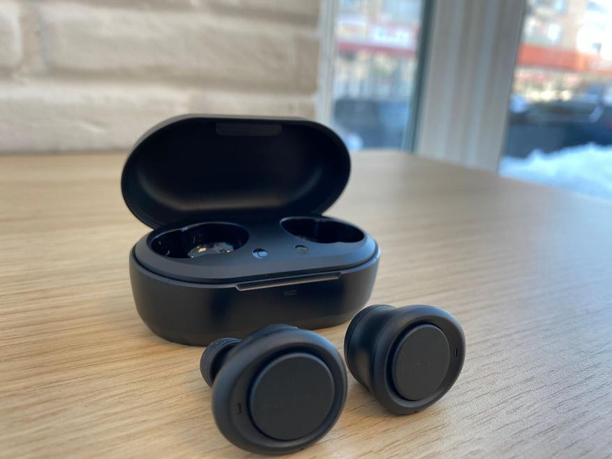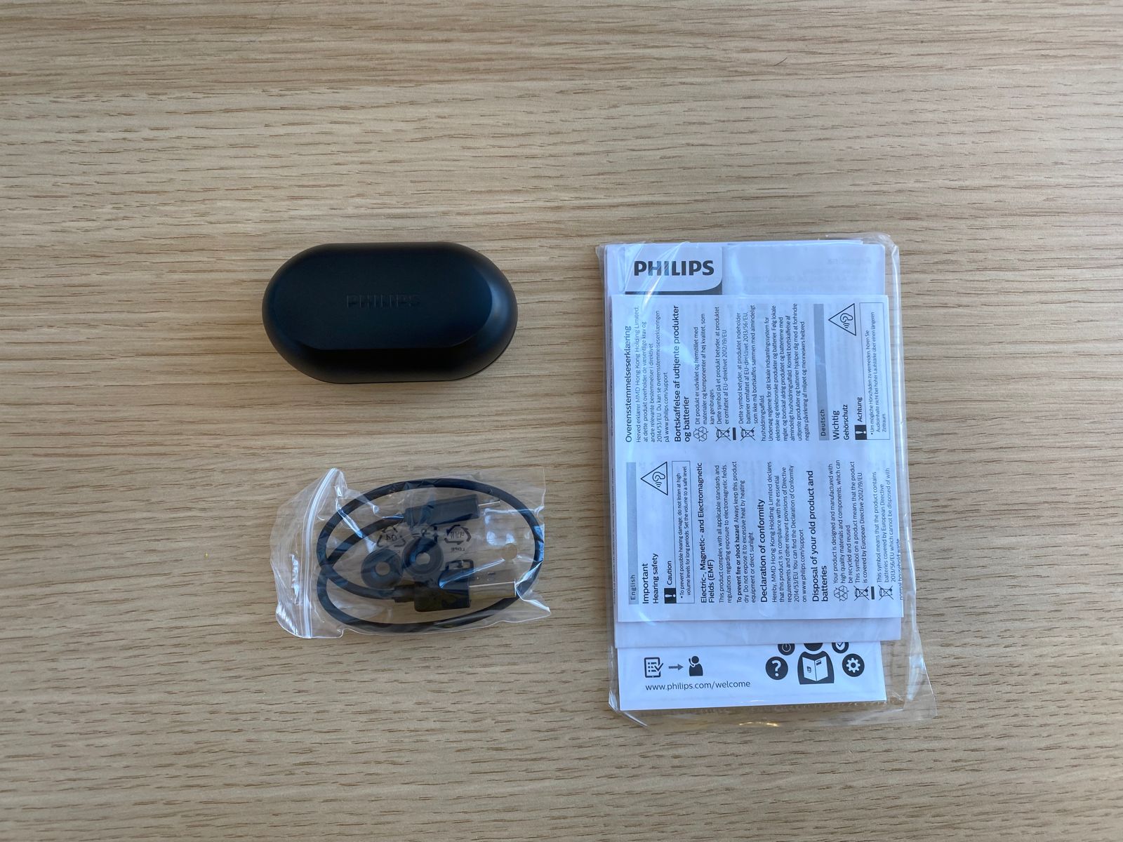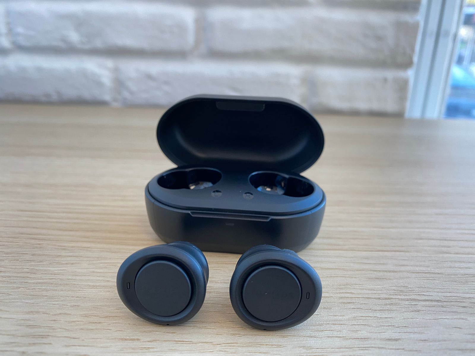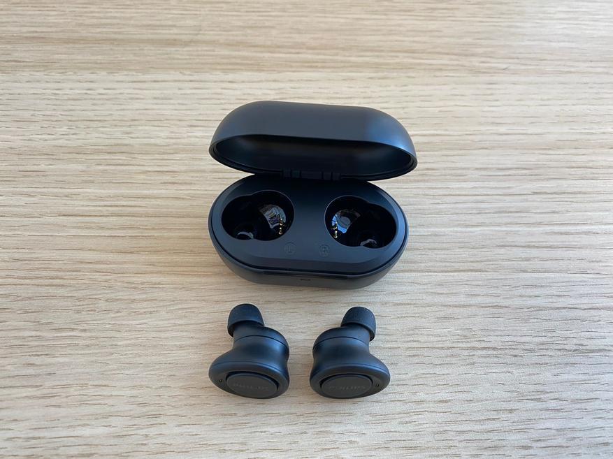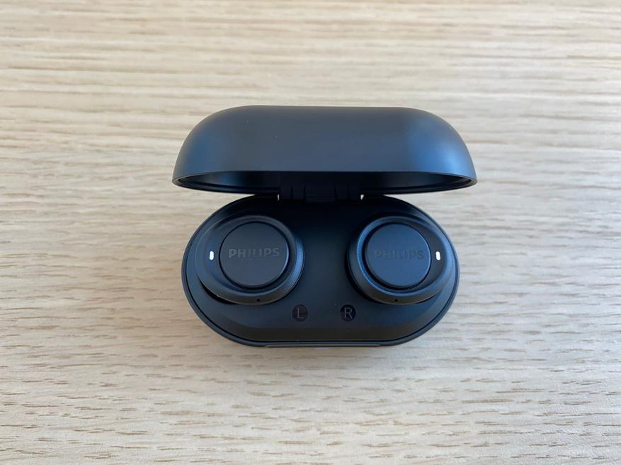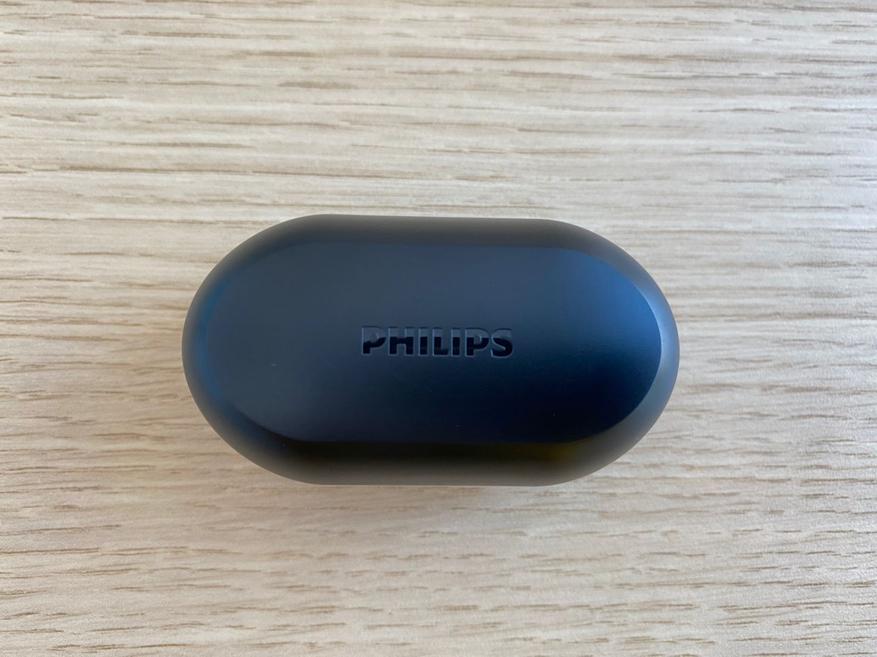 Хочу начать с того, что Philips TAT1215 продаётся только в одном цветовом решении — черный. На верхней стороне кейса расположился логотип компании. Сам зарядный чехол выполнен из достаточно твёрдого матового пластика.