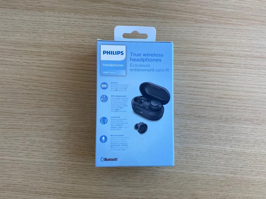 Поставляются Philips TAT1215 в голубой коробке из картона. На лицевой стороне можем увидеть изображение кейса с рядом лежащими наушниками. Помимо рисунка, также есть небольшой перечень особенностей этой модели.
