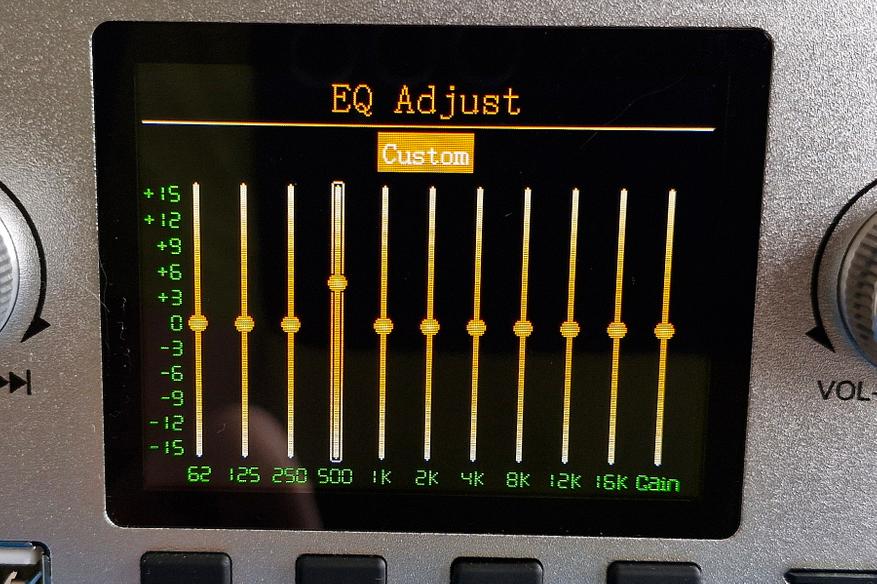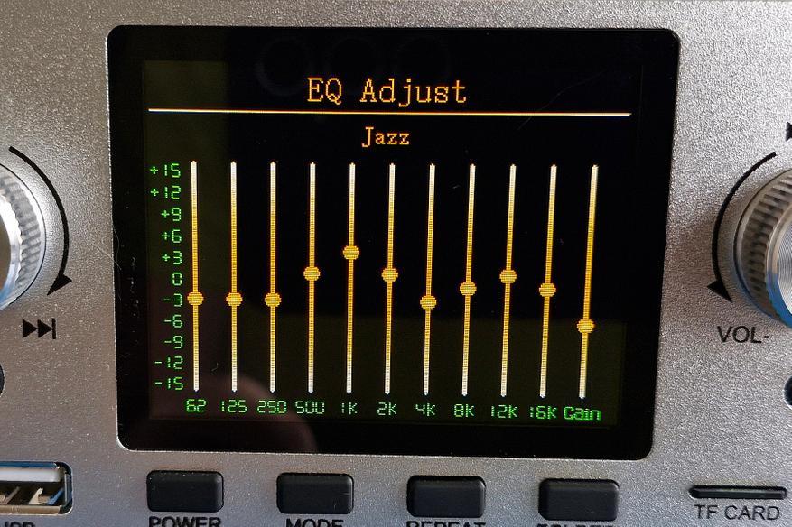 В меню доступен эквалайзер с ручной настройкой (+- 15 дБ) и готовыми установками (6 шт.):