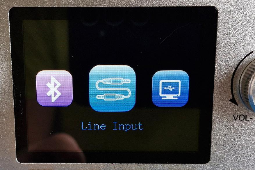 В дизайне прослеживается симметрия: под левым энкодером линейный вход 3,5 мм, под правым — приемник для пульта ДУ, ниже разъемы для носителей. Под экраном четыре прорезиненные кнопки. Какого-то бренда или марки тут не указано.