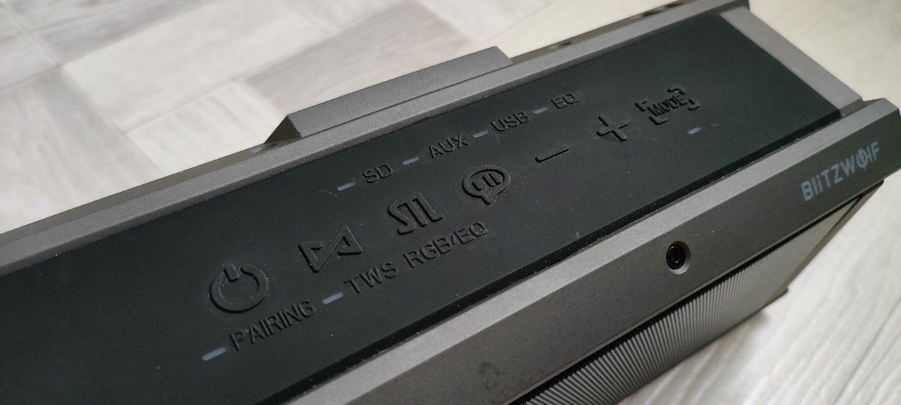 BlitzWolf BW‑WA3 оснащена четырьмя динамиками: по два на высокие и низкие частоты, плюс два пассивных излучателя по бокам для усиления баса. Суммарная мощность — 100 Вт (хотя реальные показатели ближе к 70 Вт), Тем не менее, звук мощный, физически ощутимый(вибрации). Звучание агрессивное, с акцентом на низкие частоты — идеально для электронной музыки, хип‑хопа и рок‑композиций.