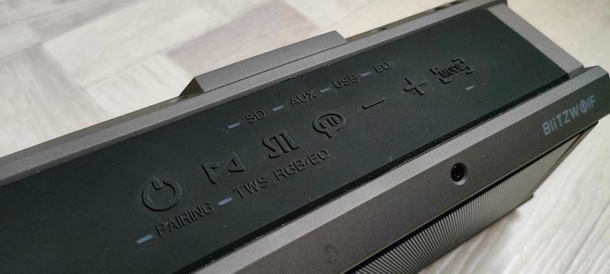 На верхней панели — резиновая вставка с кнопками управления. Они тактильные, с чётким ходом, символы объёмные — легко найти на ощупь даже в темноте. Слева направо расположены: кнопка включения/выключения — с индикатором питания (синий светодиод), символ бесконечности — активация TWS‑режима (объединение двух колонок в стереопару), кнопка эквалайзера — переключение пресетов (каждое нажатие меняет режим, сопровождается цветовым индикатором), кнопка «плей/стоп» — также отвечает за приём/сброс звонков, кнопки регулировки громкости — плюс/минус, а также переключение треков (долгое нажатие вперёд/назад), кнопка MODE — переключение источников сигнала (Bluetooth, AUX, microSD, USB). Долгое удержание: 3 с — разрыв Bluetooth‑соединения, 8 с — сброс настроек Bluetooth.