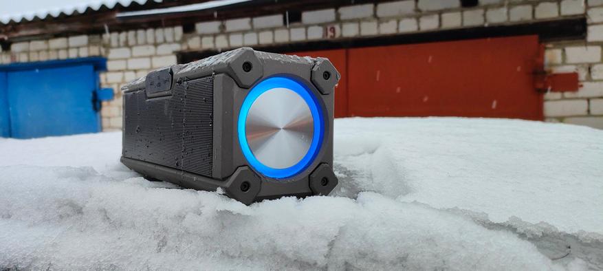 Достоинства: мощный, драйвовый звук с акцентом на басы, RGB‑подсветка в такт музыке — зрелищно и атмосферно, защита IPX5 — не боится брызг и дождя, TWS‑режим — возможность создать стереопару, воспроизведение с microSD и USB — не нужен смартфон, компактный размер и вес — удобно брать в дорогу, функция пауэрбанка — экстренная зарядка гаджетов, резьба под штатив — нестандартное, но удобное решение, качественный кабель USB‑C в комплекте.