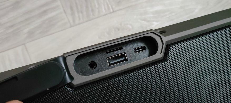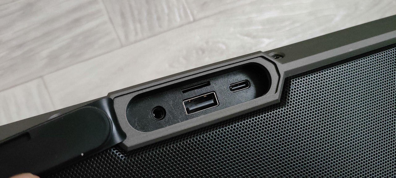 Рядом с кнопками — светодиодные индикаторы режимов и пресетов эквалайзера. Например, зелёный цвет означает отключение НЧ‑динамиков, белый — максимальное усиление баса. Удобно, что подсветка кнопок не слепит ночью. С обратной стороны — резиновая заглушка, под которой спрятаны порты: USB‑C — для зарядки колонки (5 В/2 А), AUX (3,5 мм) — подключение проводных наушников или старых устройств, слот для microSD‑карт (поддерживает до 128 Гб) — воспроизведение музыки напрямую, USB‑A — для подключения накопителей и использования колонки как пауэрбанка (5 В/1 А).
