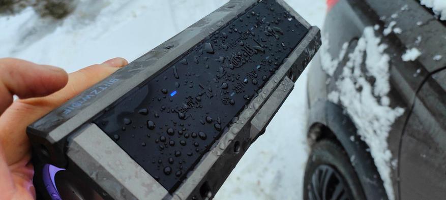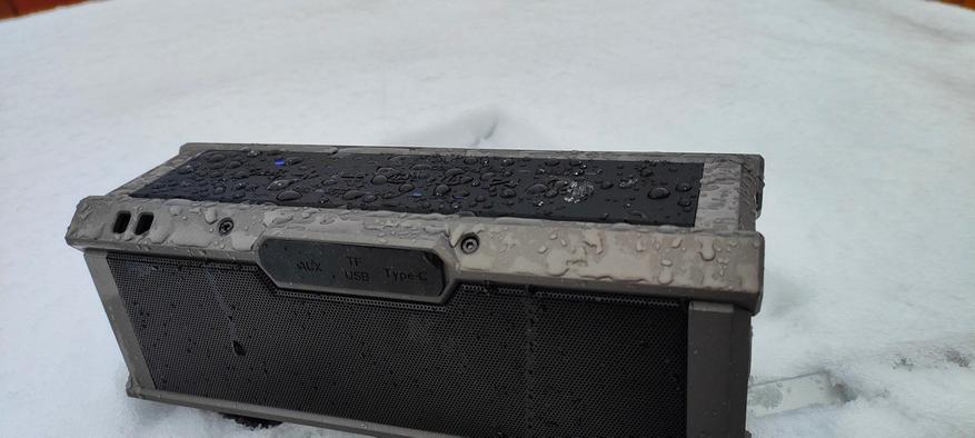 Заявленный стандарт влагозащиты — IPX5. Это означает, что колонка выдерживает брызги воды с любого направления (например, от дождя или капель брызг от бассейна во время вечеринки), не боится случайных проливов (можно поставить рядом с напитками на пикнике), подходит для использования на пляже (но не для погружения в воду), так же защищена от пыли — мелкие частицы не попадут внутрь через вентиляционные решётки.
