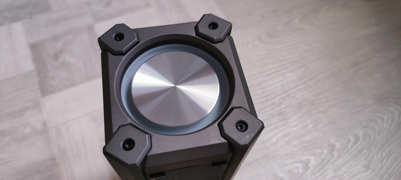 - Низкие частоты (басы): мощные, плотные, с ощутимой вибрацией корпуса. Пассивные излучатели добавляют глубины, но на максимальной громкости возможны небольшие искажения. В режиме «белый пресет» басы усиливаются ещё сильнее — для вечеринок самое то. На твёрдой поверхности (стол, пол) вибрация передаётся на окружающие предметы — это добавляет эффекта, но может раздражать в тихой обстановке. На максимальной громкости есть небольшие искажения, но до «дребезга» не доходит.