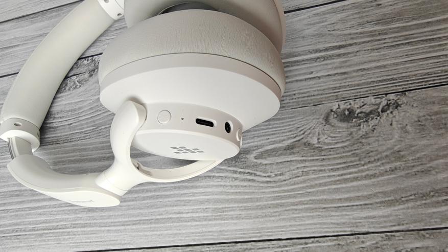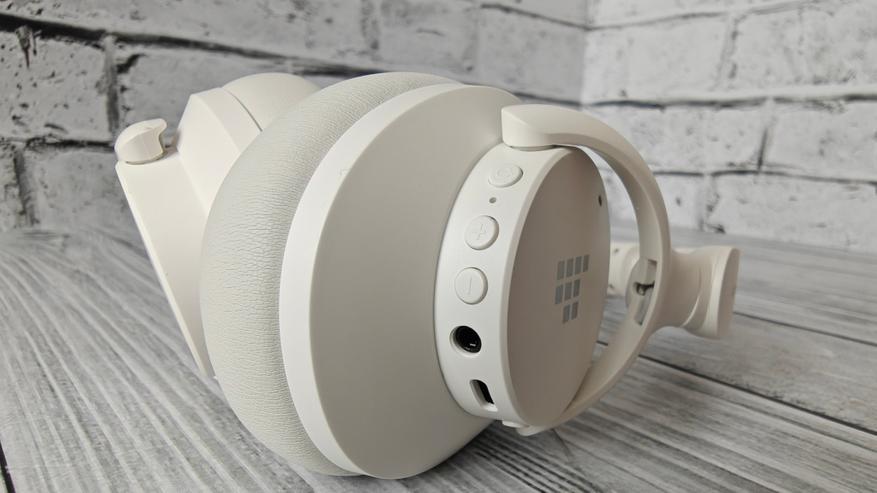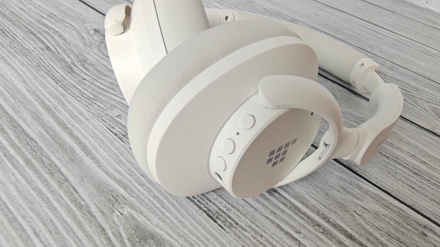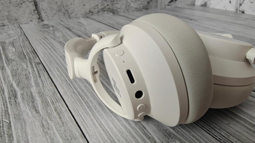 Все интерфейсы расположили на правом наушнике. Тут есть механические кнопки, хорошо выделяющиеся тактильно и обладающие заметным тактильным щелчком. Сначала идет кнопка активации шумодава с индикатором, Type-C разъем, AUX, раздельные кнопки регулировки громкости и кнопка включения с индикатором статуса работы.