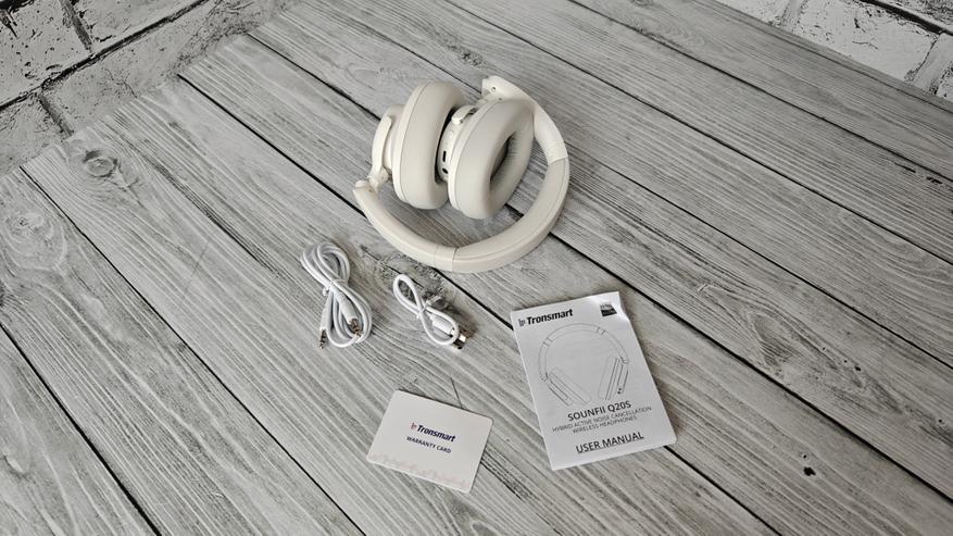 Внутри мы найдем сами наушники, Type-C кабель для зарядки аккумулятора, Aux-Aux кабель для проводного соединения и также документацию.