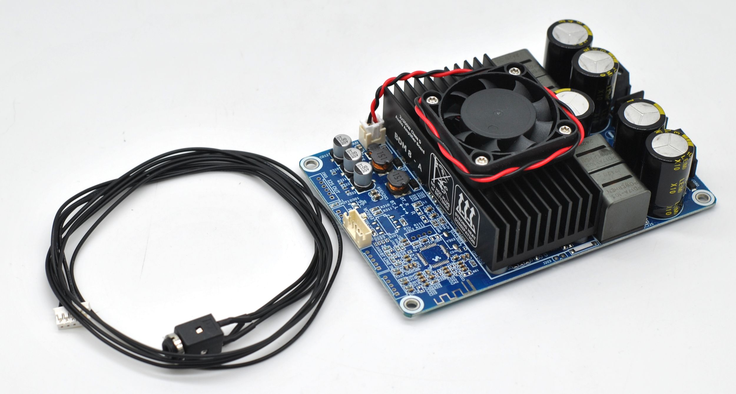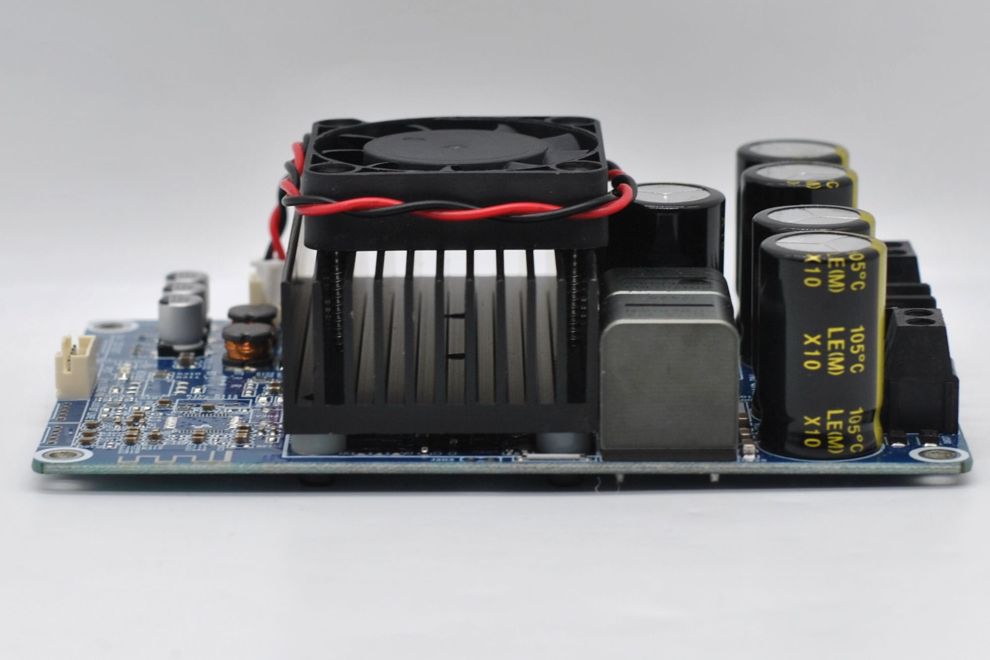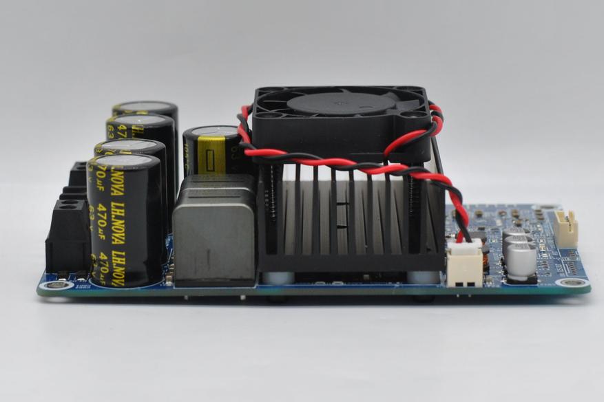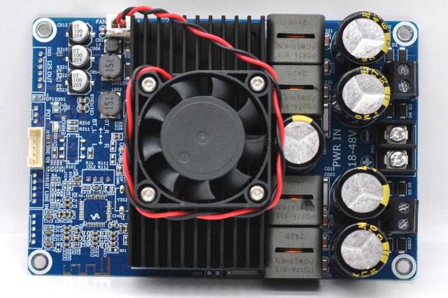 Плата выполнена на синем текстолите, регулировки громкости нет, входной сигнал подключается XH2.54 3 pin (хотя колодка на 5 pin), питание и выход на динамики винтовыми клеммами. Видно место под чип Bluetooth. Радиатор массивный шириной 8 см и на нем стоит маленький, но резкий вентилятор 4 см. Причем без термодатчика, шумно молотит при подачи питания — так себе реализация охлаждения.