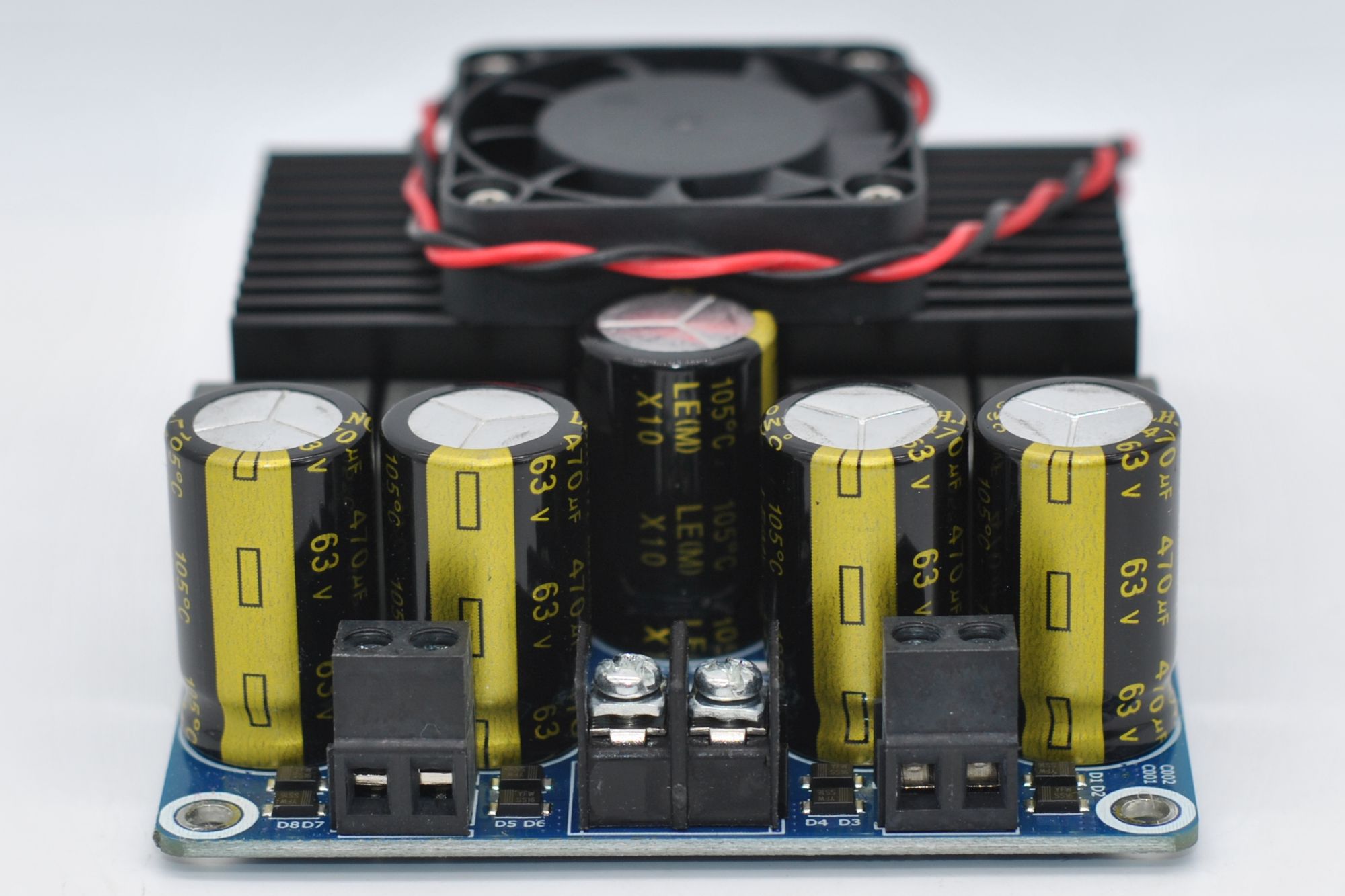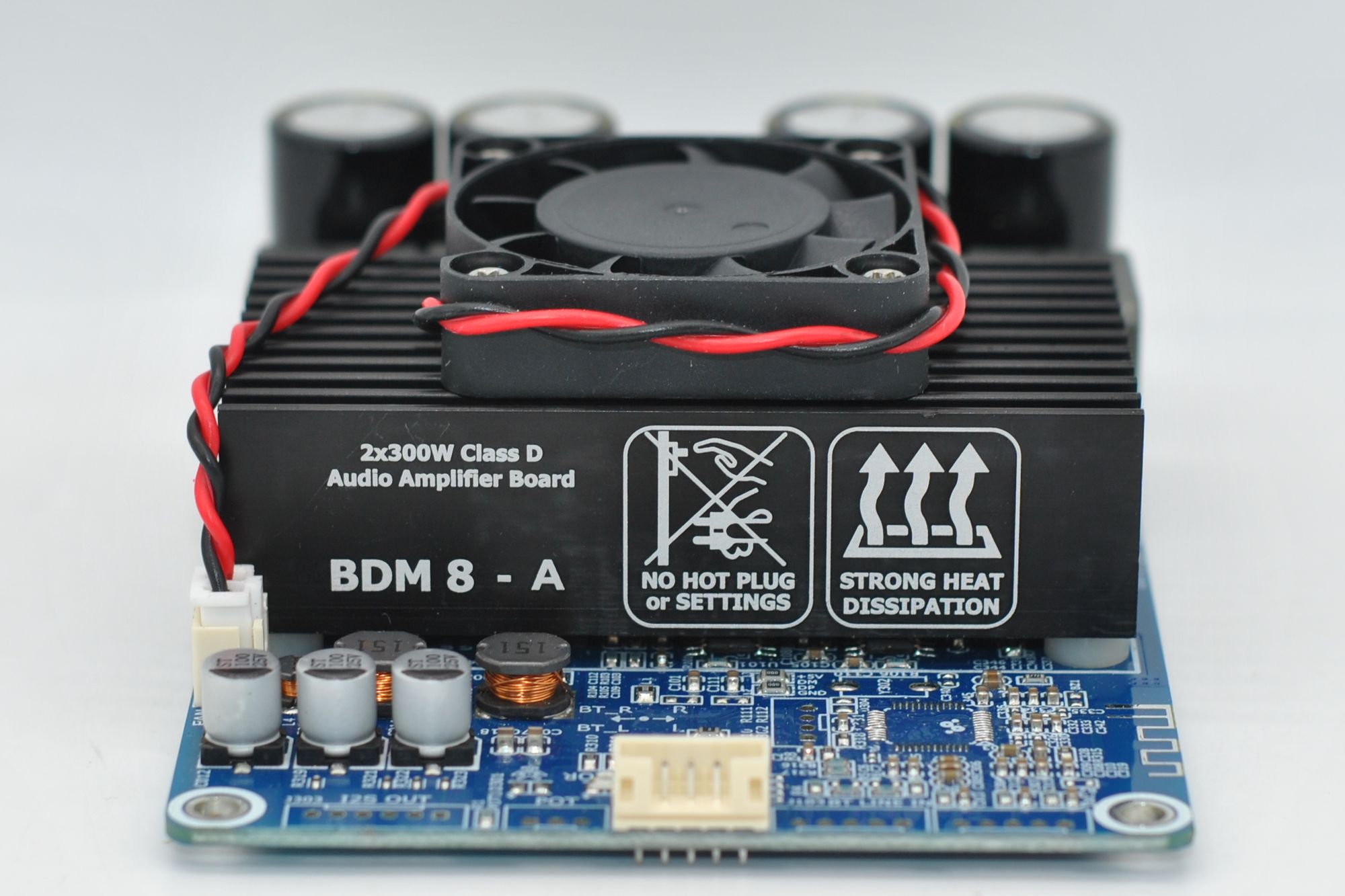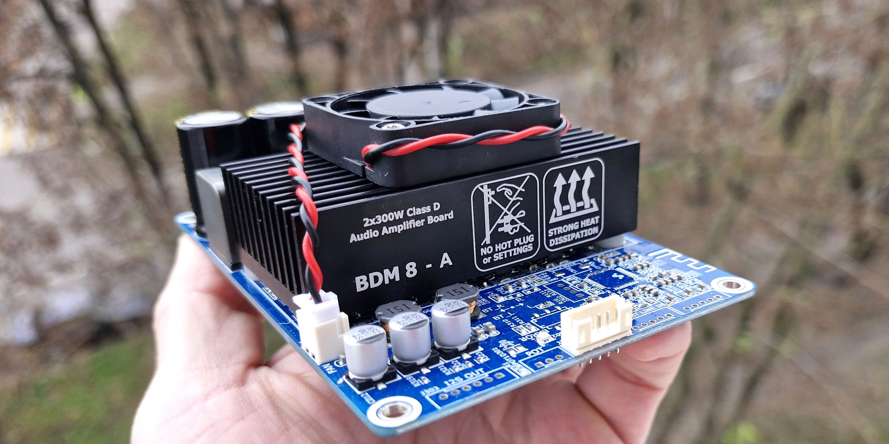 Плата выполнена на синем текстолите, регулировки громкости нет, входной сигнал подключается XH2.54 3 pin (хотя колодка на 5 pin), питание и выход на динамики винтовыми клеммами. Видно место под чип Bluetooth. Радиатор массивный шириной 8 см и на нем стоит маленький, но резкий вентилятор 4 см. Причем без термодатчика, шумно молотит при подачи питания — так себе реализация охлаждения.