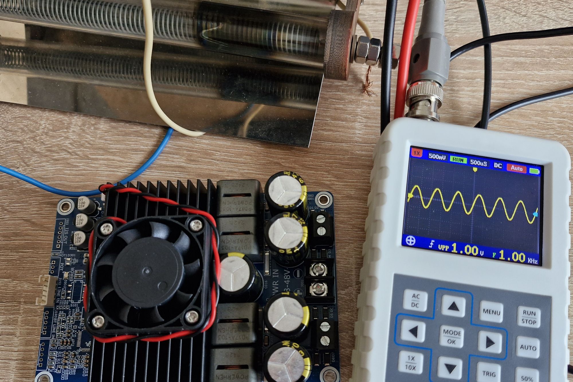 Работает плата от DC 18 В, 50 тоже переварила. Фонового шума нет, но кабель входного канала нужно использовать экранированный, а блок питания с низкими пульсациями (у меня MP-H250S48). На выходе (с закороченным входом) есть пульсации с частотой работы 450 кГц, но амплитуда маленькая.