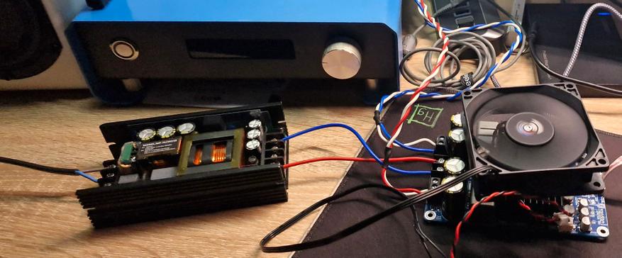 Но это не главная беда с этим вентилятором. Главная в том, что он шумит как турбина. Да, его можно отключить, но плата даже без сигнала потребляет ~7 Вт, если его использовать усилитель на мощность выше 20 Вт лучше использовать охлаждение (нагрев радиатора выше 55 градусов).