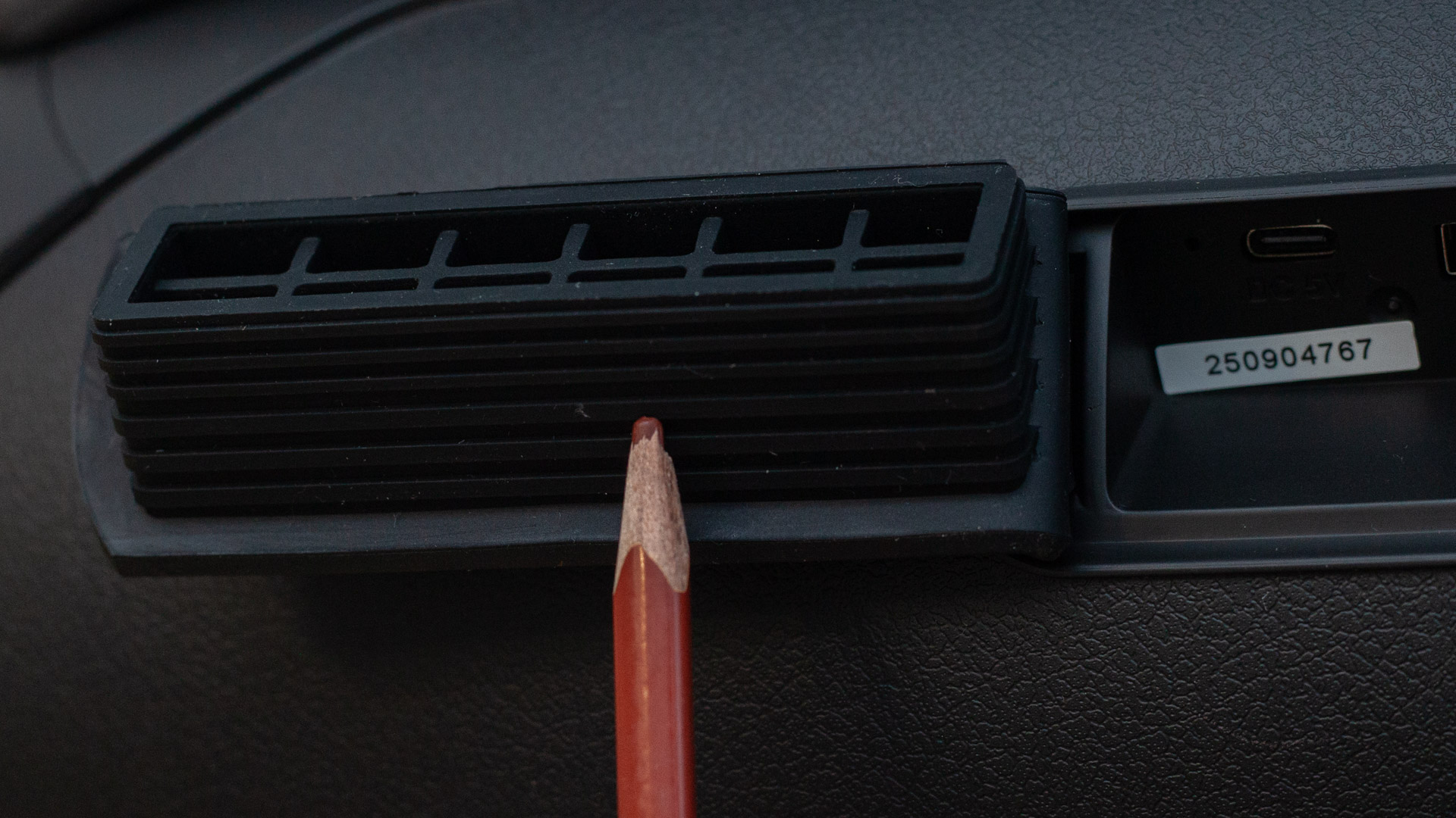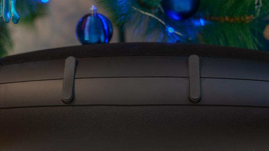 В своём рабочем положении колонка стоит на двух прорезиненных ножках, выполненных в виде сплошных полосок, а не отдельных «пятаков». Это, конечно, хорошо в плане устойчивости. Но их стоило бы сделать длиннее — центр тяжести колонки смещён вперед и если поставить её на мягкую поверхность, то «ныряет». На твёрдых поверхностях колонка стоит устойчиво. Зачастую под этими резинками прячутся головки винтов, скрепляющие части корпуса, но тут их нет.