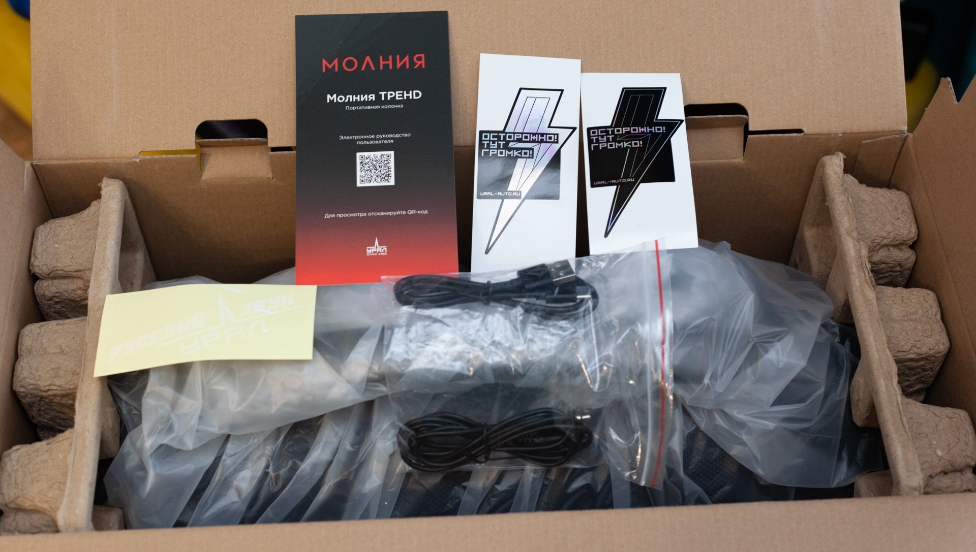 Колонка упакована в выдержанную в фирменном дизайне «Урала» черную картонную коробку. Как обычно, спереди изображение самой колонки, на обратной стороне основные технические данные.