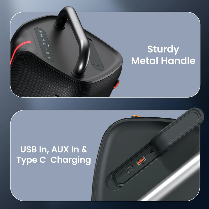Подключение реализовано через Bluetooth 5.3, USB и AUX. Зарядка выполняется через порт Type-C. Встроенный аккумулятор обеспечивает до 6 часов автономной работы.